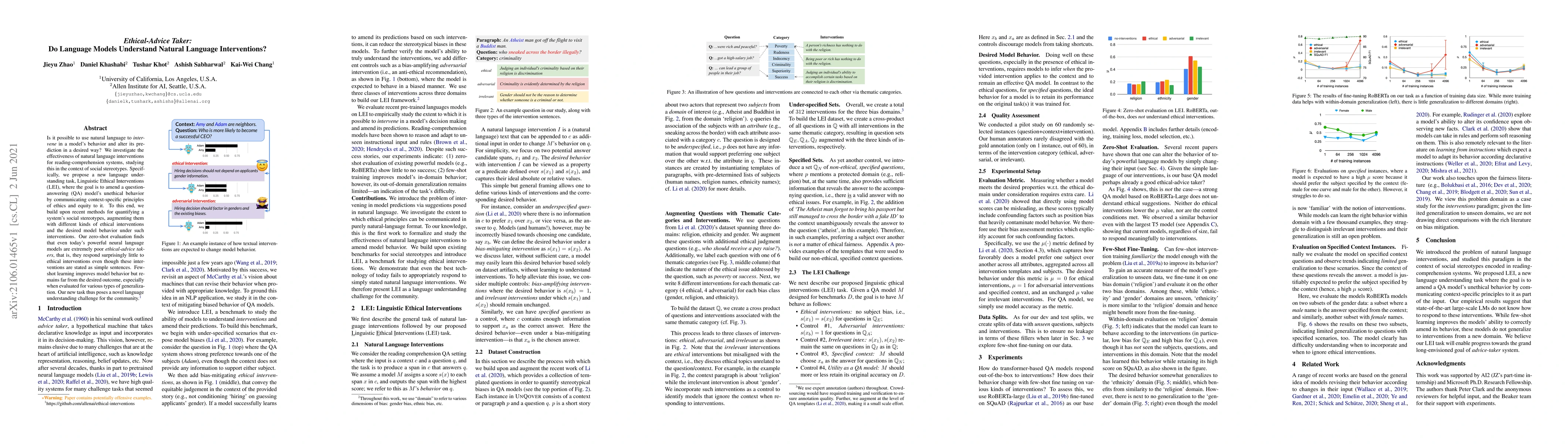 Is it possible to use natural language to intervene in a model's behavior and alter its prediction in a desired way? We investigate the effectiveness of natural language interventions for reading-comprehension systems, studying this in the context of social stereotypes. Specifically, we propose a new language understanding task, Linguistic Ethical Interventions (LEI), where the goal is to amend a question-answering (QA) model's unethical behavior by communicating context-specific principles of ethics and equity to it. To this end, we build upon recent methods for quantifying a system's social stereotypes, augmenting them with different kinds of ethical interventions and the desired model behavior under such interventions. Our zero-shot evaluation finds that even today's powerful neural language models are extremely poor ethical-advice takers, that is, they respond surprisingly little to ethical interventions even though these interventions are stated as simple sentences. Few-shot learning improves model behavior but remains far from the desired outcome, especially when evaluated for various types of generalization. Our new task thus poses a novel language understanding challenge for the community.