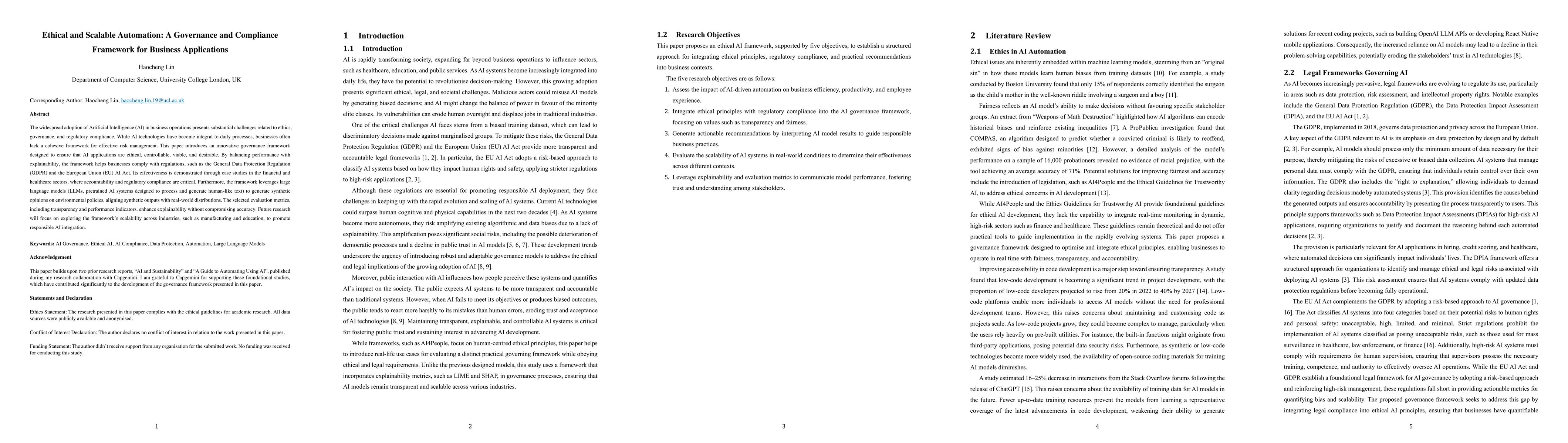 This paper proposes a governance and compliance framework to address ethical and scalable automation in business applications using AI, balancing ethical principles, controllability, viability, and desirability. Case studies illustrate the framework's effectiveness in sectors like finance and healthcare, showing enhanced transparency and performance, validated by metrics such as Chi-test scores and Jaccard indexes.