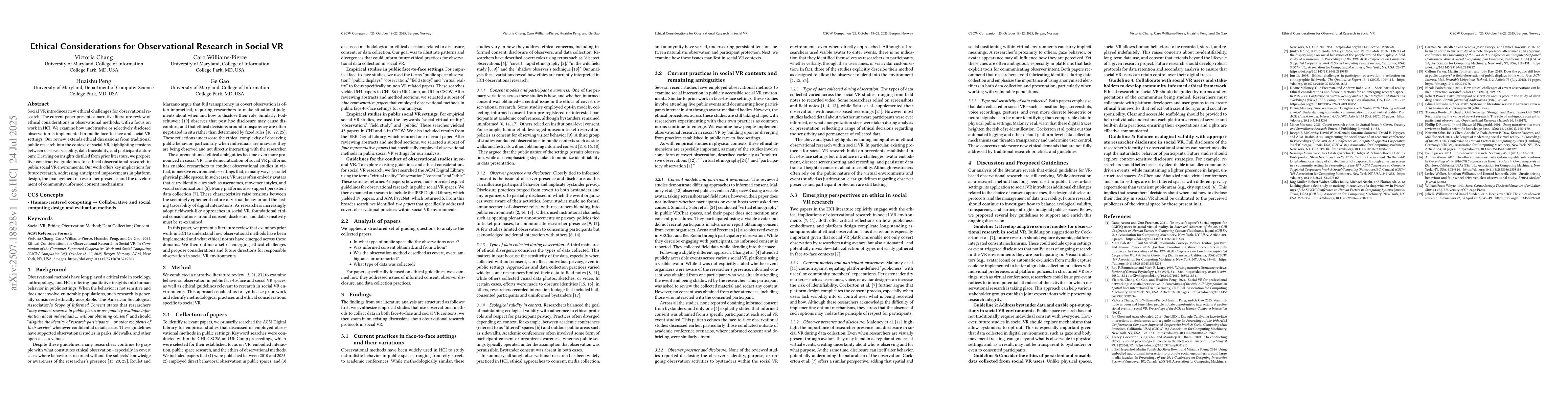 Social VR introduces new ethical challenges for observational research. The current paper presents a narrative literature review of ethical considerations in observational methods, with a focus on work in HCI. We examine how unobtrusive or selectively disclosed observation is implemented in public face-to-face and social VR settings. Our review extends ethical discussions from traditional public research into the context of social VR, highlighting tensions between observer visibility, data traceability, and participant autonomy. Drawing on insights distilled from prior literature, we propose five constructive guidelines for ethical observational research in public social VR environments. Our work offers key implications for future research, addressing anticipated improvements in platform design, the management of researcher presence, and the development of community-informed consent mechanisms.