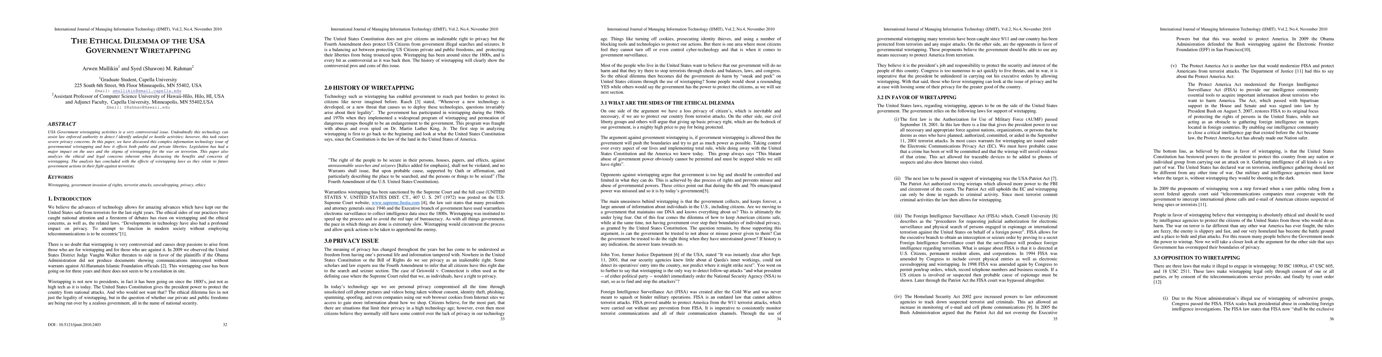 USA Government wiretapping activities is a very controversial issue. Undoubtedly this technology can assist law enforced authority to detect / identify unlawful or hostile activities; however, this task raises severe privacy concerns. In this paper, we have discussed this complex information technology issue of governmental wiretapping and how it effects both public and private liberties. Legislation has had a major impact on the uses and the stigma of wiretapping for the war on terrorism. This paper also analyzes the ethical and legal concerns inherent when discussing the benefits and concerns of wiretapping. The analysis has concluded with the effects of wiretapping laws as they relate to future government actions in their fight against terrorists.