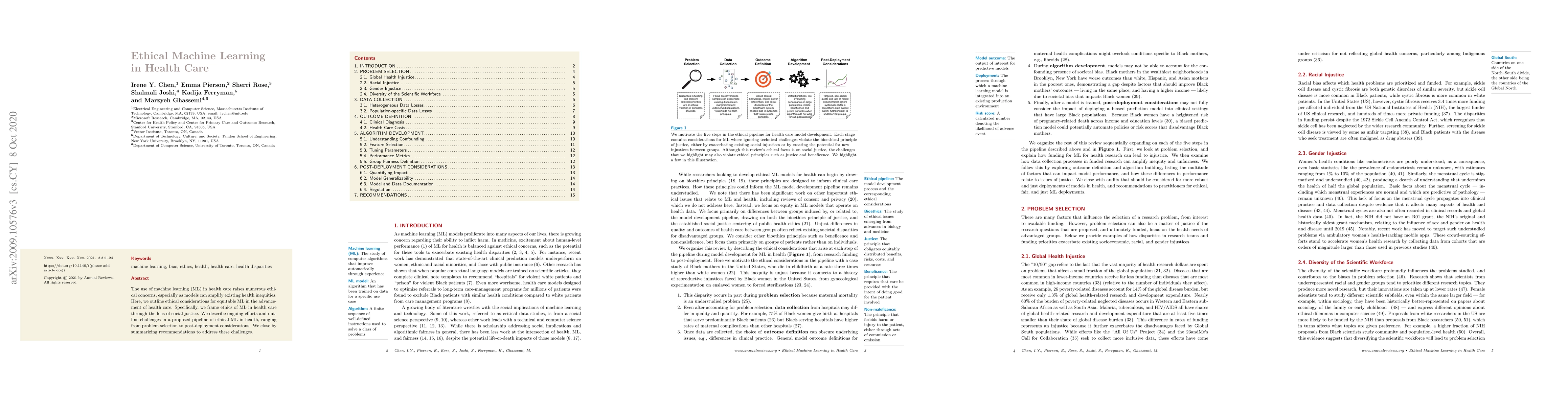 The use of machine learning (ML) in health care raises numerous ethical concerns, especially as models can amplify existing health inequities. Here, we outline ethical considerations for equitable ML in the advancement of health care. Specifically, we frame ethics of ML in health care through the lens of social justice. We describe ongoing efforts and outline challenges in a proposed pipeline of ethical ML in health, ranging from problem selection to post-deployment considerations. We close by summarizing recommendations to address these challenges.