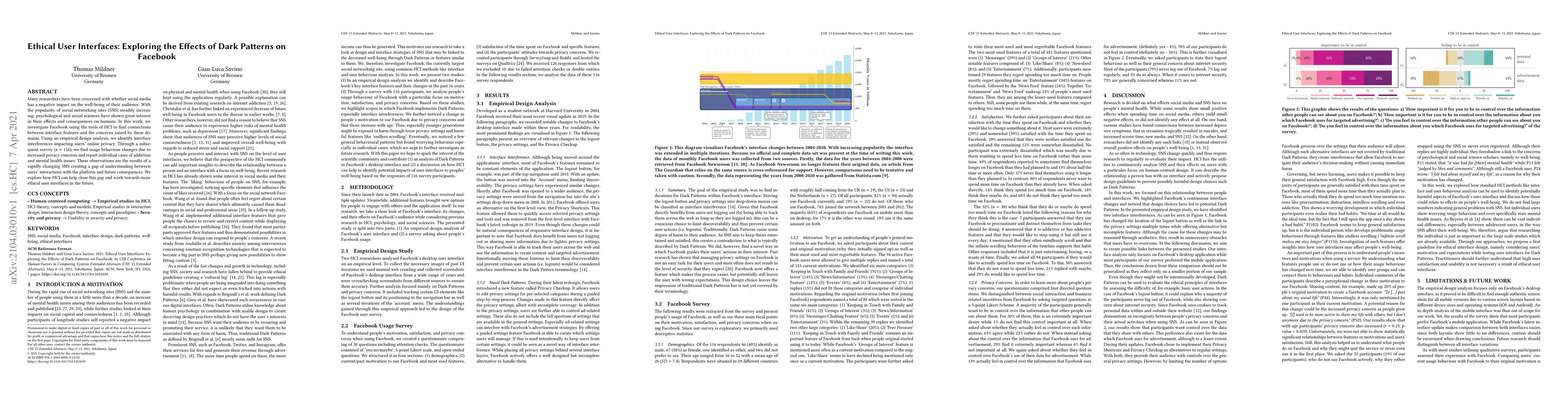 Many researchers have been concerned with whether social media has a negative impact on the well-being of their audience. With the popularity of social networking sites (SNS) steadily increasing, psychological and social sciences have shown great interest in their effects and consequences on humans. In this work, we investigate Facebook using the tools of HCI to find connections between interface features and the concerns raised by these domains. Using an empirical design analysis, we identify interface interferences impacting users' online privacy. Through a subsequent survey (n=116), we find usage behaviour changes due to increased privacy concerns and report individual cases of addiction and mental health issues. These observations are the results of a rapidly changing SNS creating a gap of understanding between users' interactions with the platform and future consequences. We explore how HCI can help close this gap and work towards more ethical user interfaces in the future.
