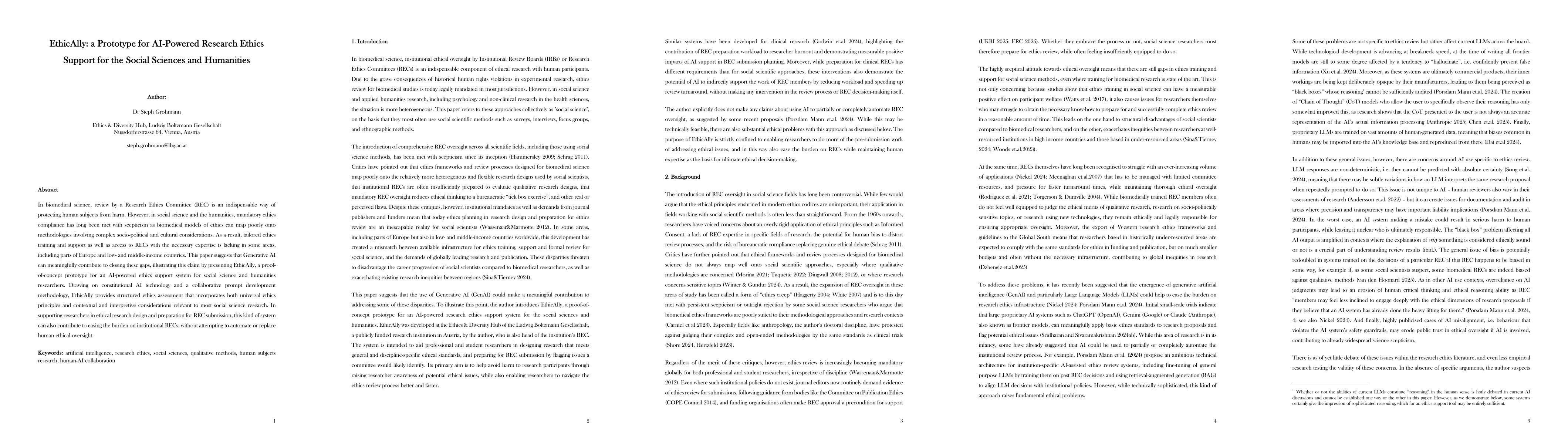 In biomedical science, review by a Research Ethics Committee (REC) is an indispensable way of protecting human subjects from harm. However, in social science and the humanities, mandatory ethics compliance has long been met with scepticism as biomedical models of ethics can map poorly onto methodologies involving complex socio-political and cultural considerations. As a result, tailored ethics training and support as well as access to RECs with the necessary expertise is lacking in some areas, including parts of Europe and low- and middle-income countries. This paper suggests that Generative AI can meaningfully contribute to closing these gaps, illustrating this claim by presenting EthicAlly, a proof-of-concept prototype for an AI-powered ethics support system for social science and humanities researchers. Drawing on constitutional AI technology and a collaborative prompt development methodology, EthicAlly provides structured ethics assessment that incorporates both universal ethics principles and contextual and interpretive considerations relevant to most social science research. In supporting researchers in ethical research design and preparation for REC submission, this kind of system can also contribute to easing the burden on institutional RECs, without attempting to automate or replace human ethical oversight.