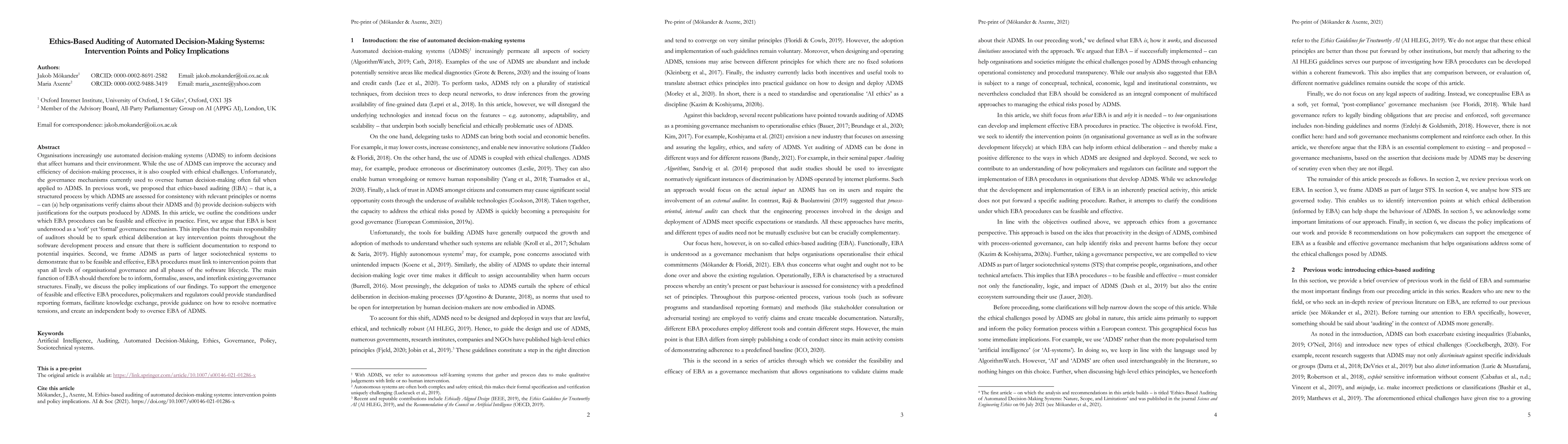 This paper proposes ethics-based auditing (EBA) as a structured, formal governance mechanism to oversee automated decision-making systems (ADMS), emphasizing its role in sparking ethical deliberation and linking to intervention points across the software lifecycle. It suggests policy measures to support the implementation of EBA, including standardized reporting and independent oversight.