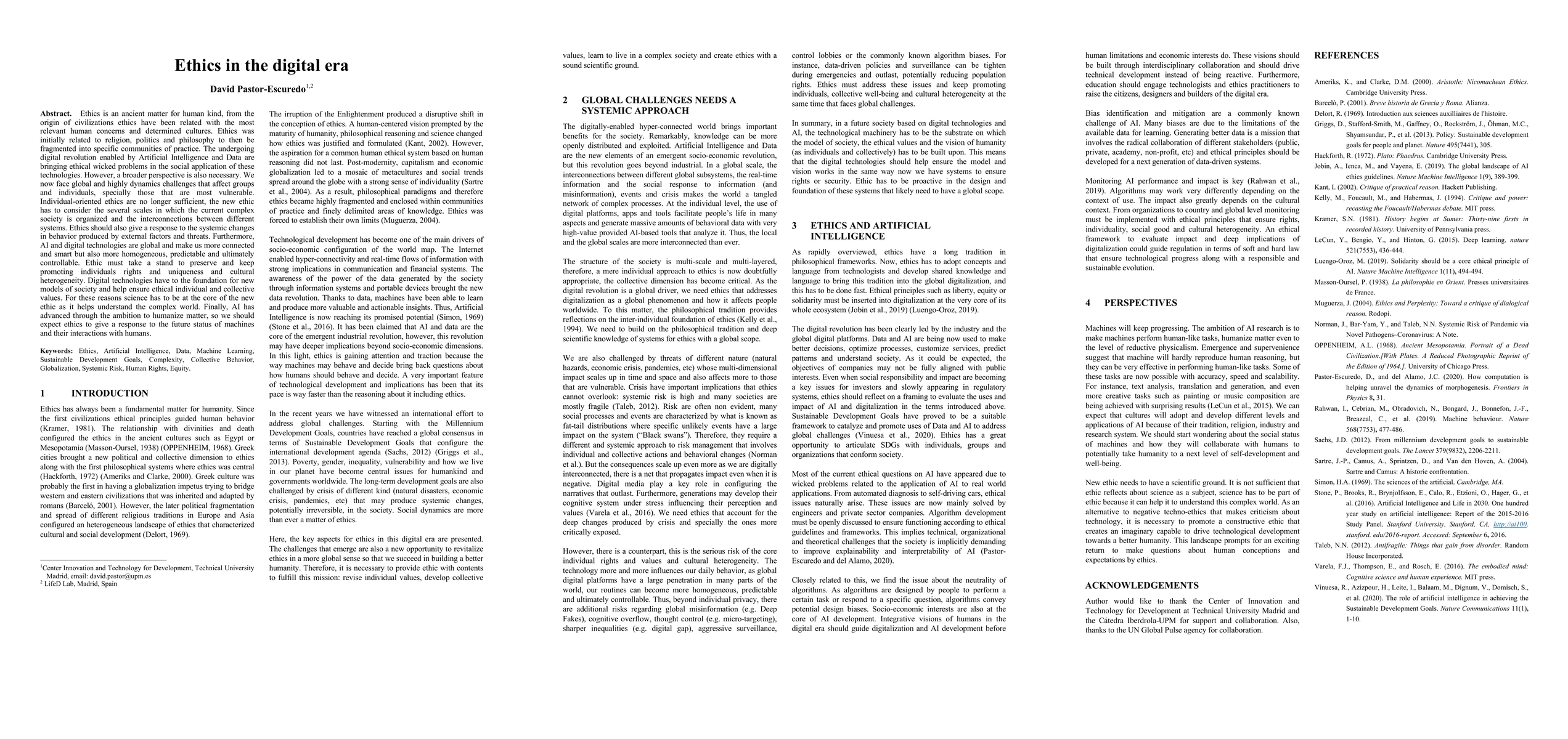 Ethics is an ancient matter for human kind, from the origin of civilizations ethics have been related with the most relevant human concerns and determined cultures. Ethics was initially related to religion, politics and philosophy to then be fragmented into specific communities of practice. The undergoing digital revolution enabled by Artificial Intelligence and Data are bringing ethical wicked problems in the social application of these technologies. However, a broader perspective is also necessary. We now face global and highly dynamics challenges that affect groups and individuals, specially those that are most vulnerable. Individual-oriented ethics are no longer sufficient, the new ethic has to consider the several scales in which the current complex society is organized and the interconnections between different systems. Ethics should also give a response to the systemic changes in behavior produced by external factors and threats. Furthermore, AI and digital technologies are global and make us more connected and smart but also more homogeneous, predictable and ultimately controllable. Ethic must take a stand to preserve and keep promoting individuals rights and uniqueness and cultural heterogeneity. Digital technologies have to the foundation for new models of society and help ensure ethical individual and collective values. For these reasons science has to be at the core of the new ethic as it helps understand the complex world. Finally, AI has advanced through the ambition to humanize matter, so we should expect ethics to give a response to the future status of machines and their interactions with humans.