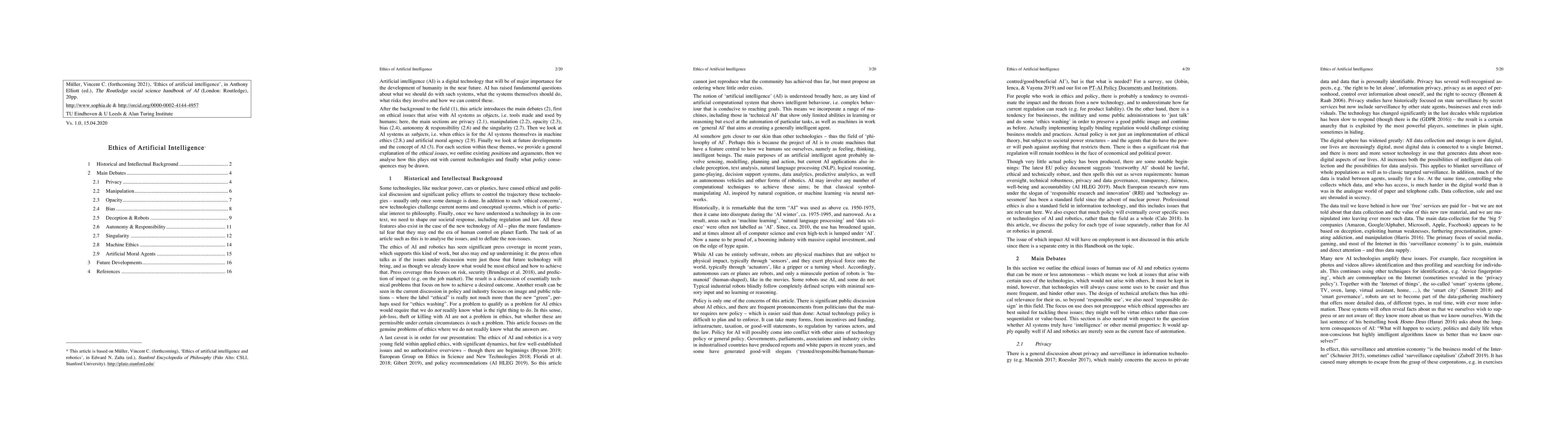 Artificial intelligence (AI) is a digital technology that will be of major importance for the development of humanity in the near future. AI has raised fundamental questions about what we should do with such systems, what the systems themselves should do, what risks they involve and how we can control these. - After the background to the field (1), this article introduces the main debates (2), first on ethical issues that arise with AI systems as objects, i.e. tools made and used by humans; here, the main sections are privacy (2.1), manipulation (2.2), opacity (2.3), bias (2.4), autonomy & responsibility (2.6) and the singularity (2.7). Then we look at AI systems as subjects, i.e. when ethics is for the AI systems themselves in machine ethics (2.8.) and artificial moral agency (2.9). Finally we look at future developments and the concept of AI (3). For each section within these themes, we provide a general explanation of the ethical issues, we outline existing positions and arguments, then we analyse how this plays out with current technologies and finally what policy consequences may be drawn.