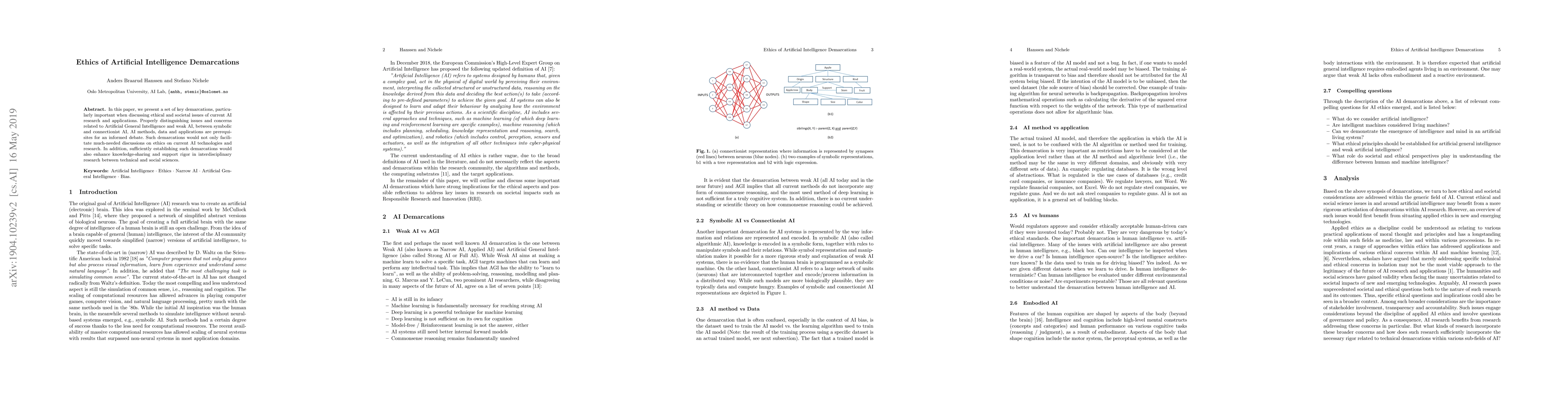 In this paper we present a set of key demarcations, particularly important when discussing ethical and societal issues of current AI research and applications. Properly distinguishing issues and concerns related to Artificial General Intelligence and weak AI, between symbolic and connectionist AI, AI methods, data and applications are prerequisites for an informed debate. Such demarcations would not only facilitate much-needed discussions on ethics on current AI technologies and research. In addition sufficiently establishing such demarcations would also enhance knowledge-sharing and support rigor in interdisciplinary research between technical and social sciences.