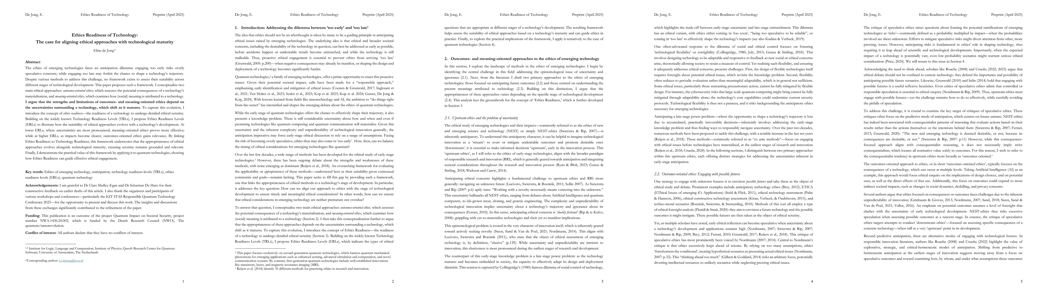 A new framework proposes a link between technological maturity and ethical readiness, offering two approaches: outcomes-oriented ethics for clear impacts and meaning-oriented ethics for uncertain technologies, with a focus on evolving ethics readiness levels.