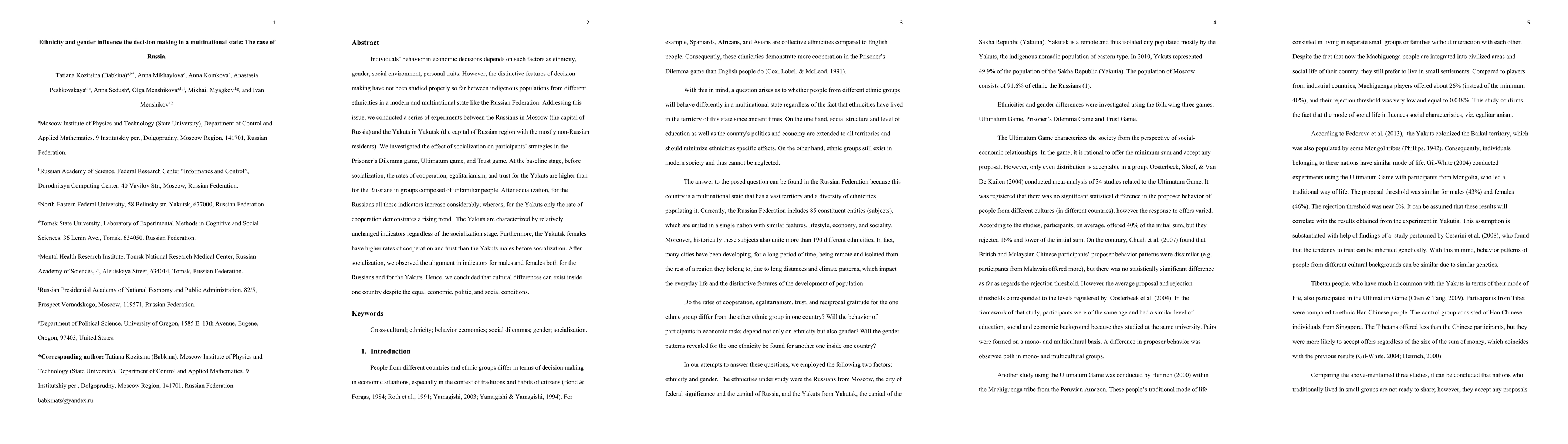 Individuals' behavior in economic decisions depends on such factors as ethnicity, gender, social environment, personal traits. However, the distinctive features of decision making have not been studied properly so far between indigenous populations from different ethnicities in a modern and multinational state like the Russian Federation. Addressing this issue, we conducted a series of experiments between the Russians in Moscow (the capital of Russia) and the Yakuts in Yakutsk (the capital of Russian region with the mostly non-Russian residents). We investigated the effect of socialization on participants' strategies in the Prisoner's Dilemma game, Ultimatum game, and Trust game. At the baseline stage, before socialization, the rates of cooperation, egalitarianism, and trust for the Yakuts are higher than for the Russians in groups composed of unfamiliar people. After socialization, for the Russians all these indicators increase considerably; whereas, for the Yakuts only the rate of cooperation demonstrates a rising trend. The Yakuts are characterized by relatively unchanged indicators regardless of the socialization stage. Furthermore, the Yakutsk females have higher rates of cooperation and trust than the Yakuts males before socialization. After socialization, we observed the alignment in indicators for males and females both for the Russians and for the Yakuts. Hence, we concluded that cultural differences can exist inside one country despite the equal economic, politic, and social conditions.