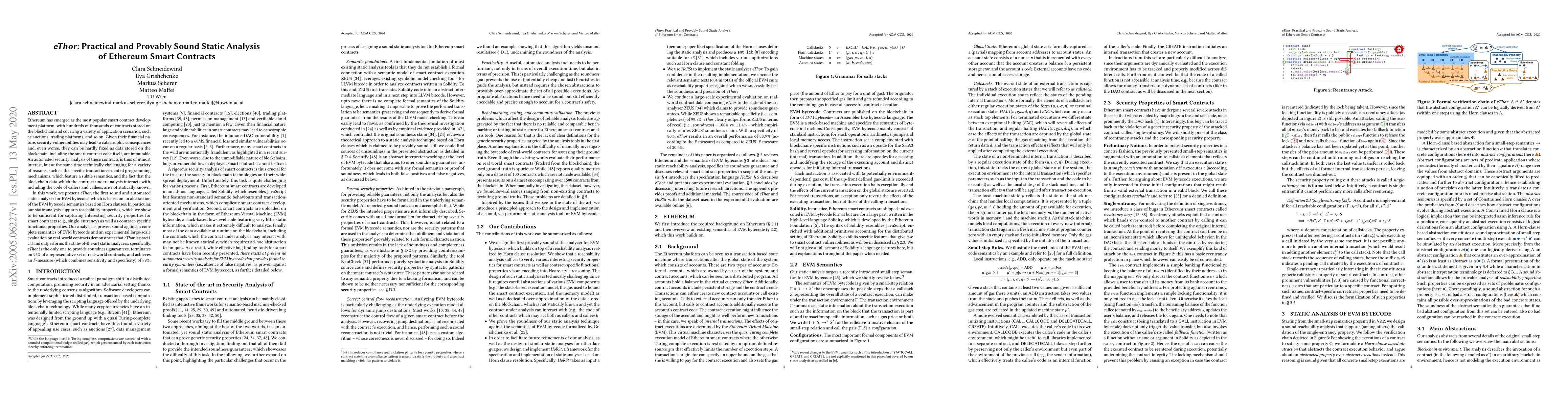 eThor is a novel static analyzer for Ethereum smart contracts, providing sound security analysis based on EVM bytecode semantics abstracted via Horn clauses. It demonstrates practical effectiveness and outperforms existing tools by ensuring soundness, terminating on 95% of real-world contracts, and achieving an F-measure of 89%.
