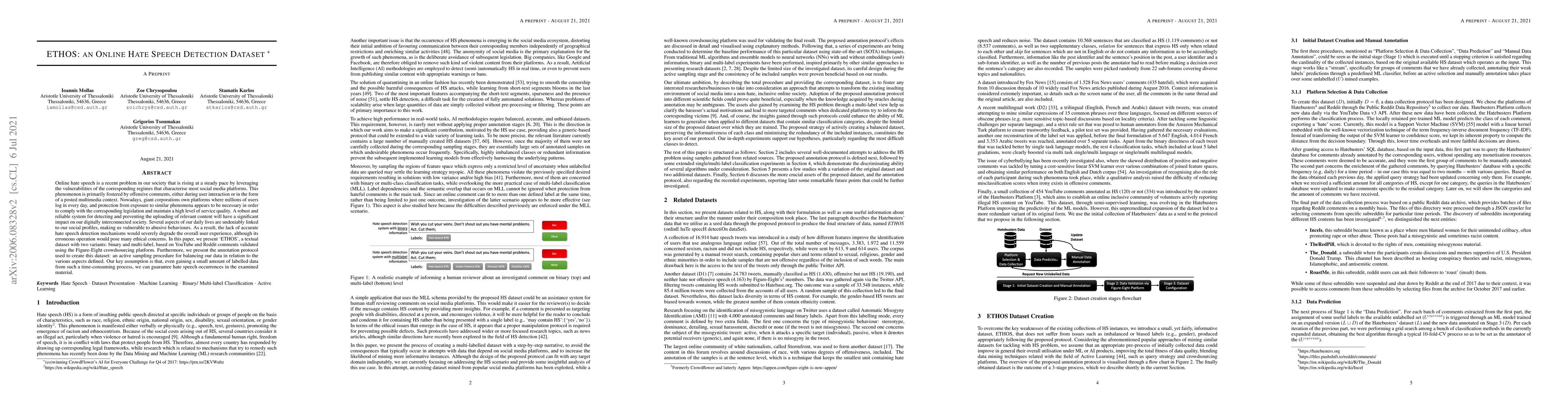 Online hate speech is a recent problem in our society that is rising at a steady pace by leveraging the vulnerabilities of the corresponding regimes that characterise most social media platforms. This phenomenon is primarily fostered by offensive comments, either during user interaction or in the form of a posted multimedia context. Nowadays, giant corporations own platforms where millions of users log in every day, and protection from exposure to similar phenomena appears to be necessary in order to comply with the corresponding legislation and maintain a high level of service quality. A robust and reliable system for detecting and preventing the uploading of relevant content will have a significant impact on our digitally interconnected society. Several aspects of our daily lives are undeniably linked to our social profiles, making us vulnerable to abusive behaviours. As a result, the lack of accurate hate speech detection mechanisms would severely degrade the overall user experience, although its erroneous operation would pose many ethical concerns. In this paper, we present 'ETHOS', a textual dataset with two variants: binary and multi-label, based on YouTube and Reddit comments validated using the Figure-Eight crowdsourcing platform. Furthermore, we present the annotation protocol used to create this dataset: an active sampling procedure for balancing our data in relation to the various aspects defined. Our key assumption is that, even gaining a small amount of labelled data from such a time-consuming process, we can guarantee hate speech occurrences in the examined material.