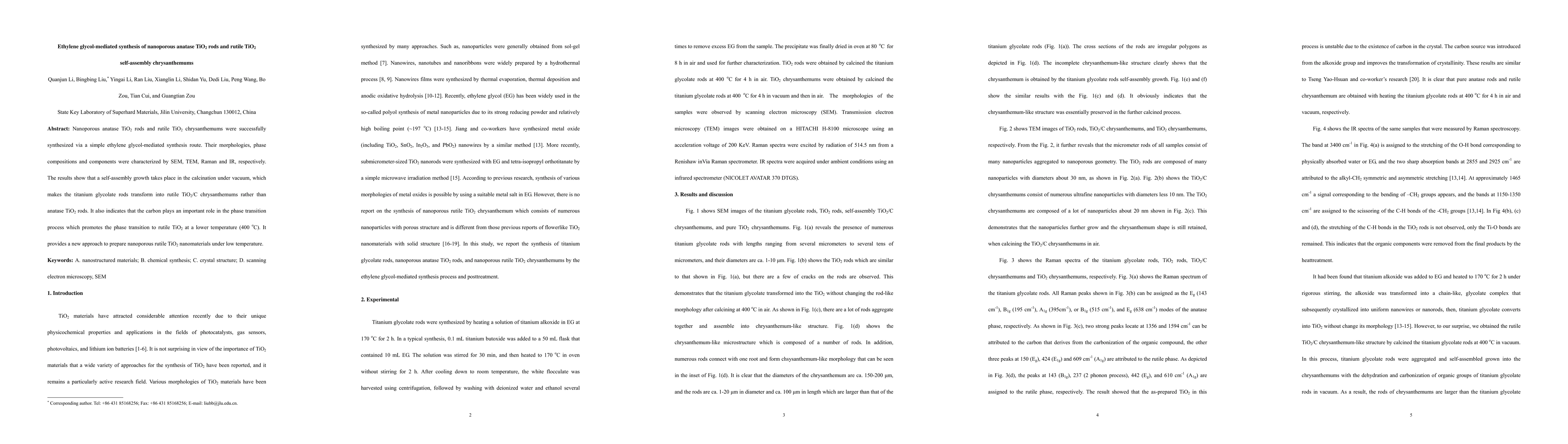 This paper reports the ethylene glycol-mediated synthesis of nanoporous anatase TiO2 rods and rutile TiO2 chrysanthemums, revealing a self-assembly process under vacuum calcination that facilitates the phase transition to rutile TiO2 at 400°C, with carbon playing a crucial role in this transformation.