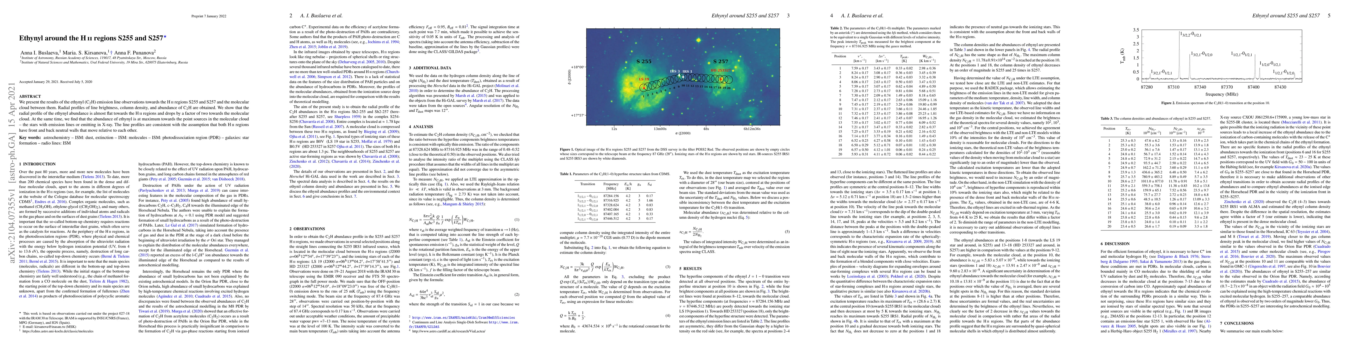 We present the results of the ethynyl (C2H) emission line observations towards the HII regions S255 and S257 and the molecular cloud between them. Radial profiles of line brightness, column density, and abundance of C2H are obtained. We show that the radial profile of the ethynyl abundance is almost flat towards the HII regions and drops by a factor of two towards the molecular cloud. At the same time, we find that the abundance of ethynyl is at maximum towards the point sources in the molecular cloud -- the stars with emission lines or emitting in X-ray. The line profiles are consistent with the assumption that both HII regions have front and back neutral walls that move relative to each other.