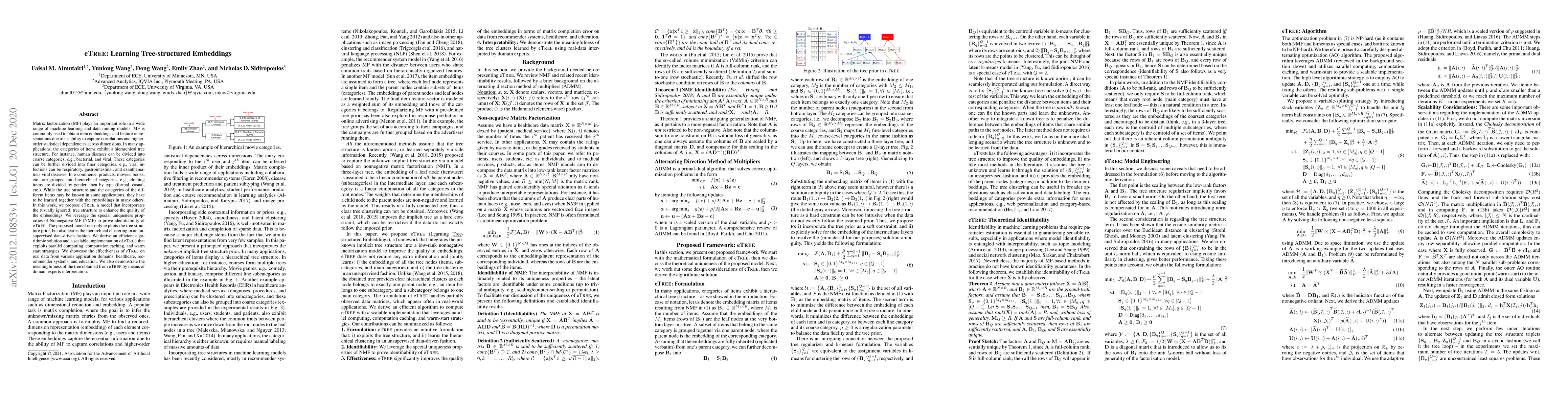 Matrix factorization (MF) plays an important role in a wide range of machine learning and data mining models. MF is commonly used to obtain item embeddings and feature representations due to its ability to capture correlations and higher-order statistical dependencies across dimensions. In many applications, the categories of items exhibit a hierarchical tree structure. For instance, human diseases can be divided into coarse categories, e.g., bacterial, and viral. These categories can be further divided into finer categories, e.g., viral infections can be respiratory, gastrointestinal, and exanthematous viral diseases. In e-commerce, products, movies, books, etc., are grouped into hierarchical categories, e.g., clothing items are divided by gender, then by type (formal, casual, etc.). While the tree structure and the categories of the different items may be known in some applications, they have to be learned together with the embeddings in many others. In this work, we propose eTREE, a model that incorporates the (usually ignored) tree structure to enhance the quality of the embeddings. We leverage the special uniqueness properties of Nonnegative MF (NMF) to prove identifiability of eTREE. The proposed model not only exploits the tree structure prior, but also learns the hierarchical clustering in an unsupervised data-driven fashion. We derive an efficient algorithmic solution and a scalable implementation of eTREE that exploits parallel computing, computation caching, and warm start strategies. We showcase the effectiveness of eTREE on real data from various application domains: healthcare, recommender systems, and education. We also demonstrate the meaningfulness of the tree obtained from eTREE by means of domain experts interpretation.