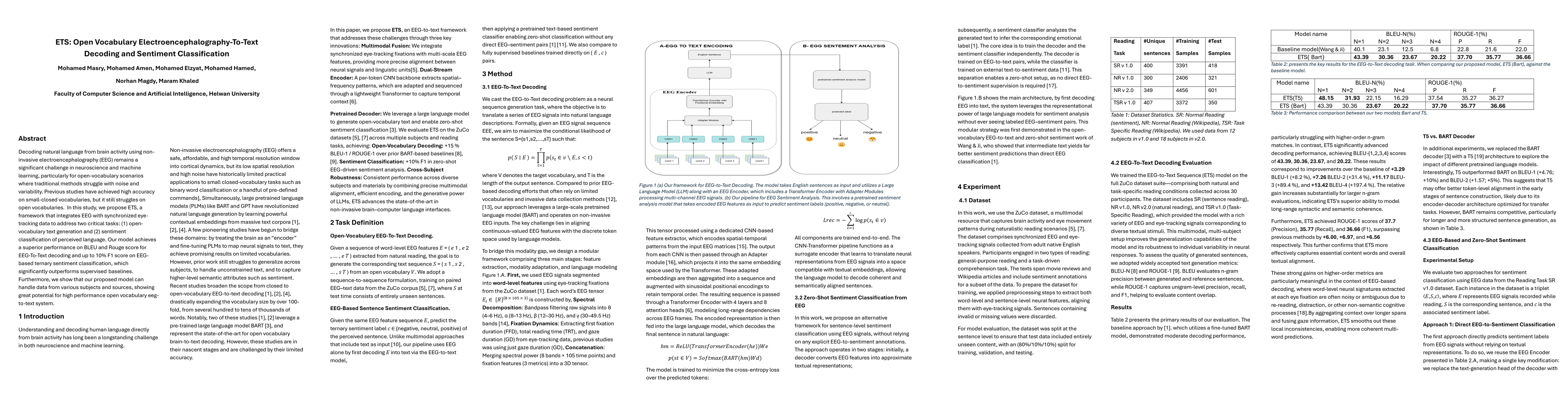 Decoding natural language from brain activity using non-invasive electroencephalography (EEG) remains a significant challenge in neuroscience and machine learning, particularly for open-vocabulary scenarios where traditional methods struggle with noise and variability. Previous studies have achieved high accuracy on small-closed vocabularies, but it still struggles on open vocabularies. In this study, we propose ETS, a framework that integrates EEG with synchronized eye-tracking data to address two critical tasks: (1) open-vocabulary text generation and (2) sentiment classification of perceived language. Our model achieves a superior performance on BLEU and Rouge score for EEG-To-Text decoding and up to 10% F1 score on EEG-based ternary sentiment classification, which significantly outperforms supervised baselines. Furthermore, we show that our proposed model can handle data from various subjects and sources, showing great potential for high performance open vocabulary eeg-to-text system.