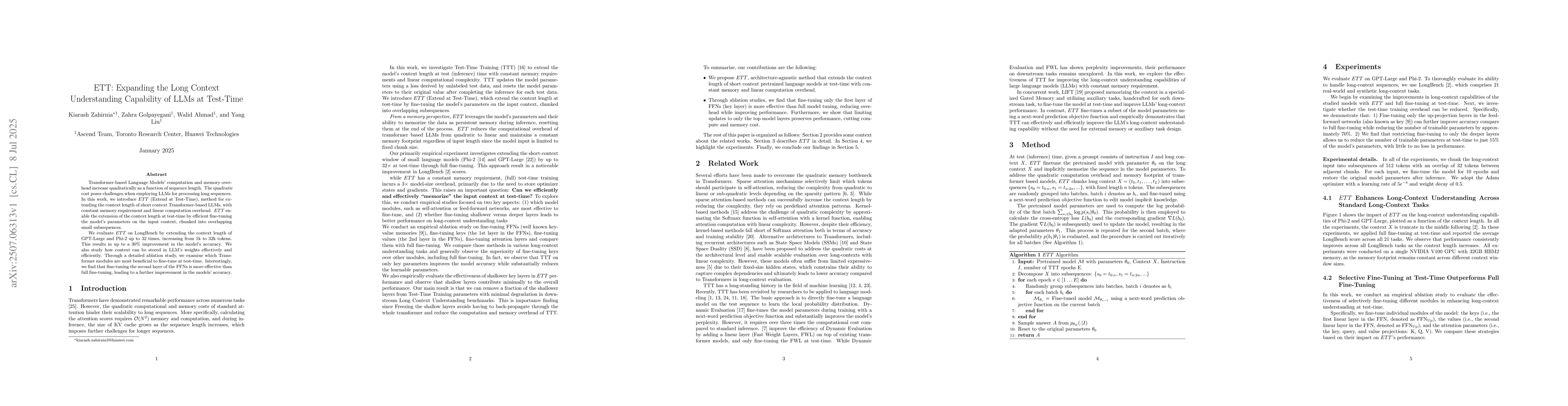 Transformer-based Language Models' computation and memory overhead increase quadratically as a function of sequence length. The quadratic cost poses challenges when employing LLMs for processing long sequences. In this work, we introduce \ourmodelacronym~(Extend at Test-Time), method for extending the context length of short context Transformer-based LLMs, with constant memory requirement and linear computation overhead. ETT enable the extension of the context length at test-time by efficient fine-tuning the model's parameters on the input context, chunked into overlapping small subsequences. We evaluate ETT on LongBench by extending the context length of GPT-Large and Phi-2 up to 32 times, increasing from 1k to 32k tokens. This results in up to a 30 percent improvement in the model's accuracy. We also study how context can be stored in LLM's weights effectively and efficiently. Through a detailed ablation study, we examine which Transformer modules are most beneficial to fine-tune at test-time. Interestingly, we find that fine-tuning the second layer of the FFNs is more effective than full fine-tuning, leading to a further improvement in the models' accuracy.