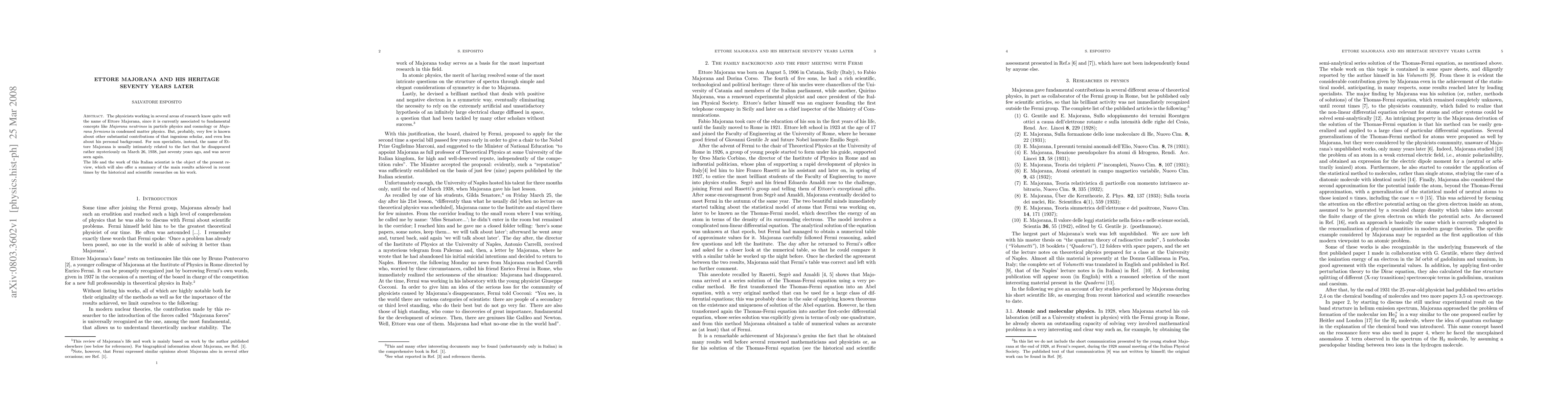 The physicists working in several areas of research know quite well the name of Ettore Majorana, since it is currently associated to fundamental concepts like {\it Majorana neutrinos} in particle physics and cosmology or {\it Majorana fermions} in condensed matter physics. But, probably, very few is known about other substantial contributions of that ingenious scholar, and even less about his personal background. For non specialists, instead, the name of Ettore Majorana is usually intimately related to the fact that he disappeared rather mysteriously on March 26, 1938, just seventy years ago, and was never seen again. The life and the work of this Italian scientist is the object of the present review, which will also offer a summary of the main results achieved in recent times by the historical and scientific researches on his work.