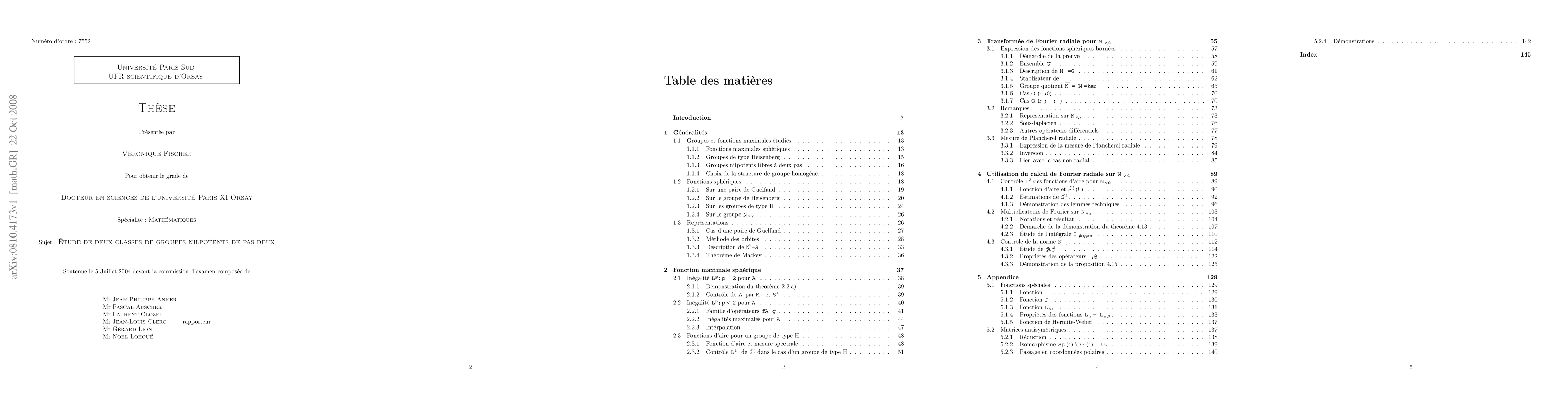 The aim of my PhD work is to study the $L^p$-boundedness of operators on two classes of two-step nilpotent Lie groups, using Plancherel formulas and spherical functions as tools. The first class of groups consists of the groups of Heisenberg type, and the second, of the two-step free nilpotent Lie groups (denoted $N_{v,2}$ for $v$ generators). In the latter case, we develop a radial Fourier calculus. Our study has focused on the maximal functions associated with Kor\'anyi spheres, together with their square functions, and the convolution operator defined with the radial Fourier calculus on the two-step free nilpotent Lie group (radial Fourier multipliers problem). In fact, one chapter of this work is devoted to the proof of $L^p$-inequalities for the maximal spherical function on the two considered classes of groups. Our method is based on interpolation for the same operator family as in the euclidean case, on $L^p$-boundedness for the standard maximal function, and $L^2$-inequalities for square functions. These $L^2$-inequalities are based on Plancherel formula and on the properties of bounded spherical functions for the orthogonal group. On $N_{v,2}$, we construct the bounded spherical functions using representations of the semidirect product of $N_{v,2}$ with the orthogonal group. We also obtain some properties of the Kohn sublaplacian and the radial Plancherel measure. Then we present a first study of the radial Fourier multiplier problem, with the aim of giving our solutions for some technicals difficulties.