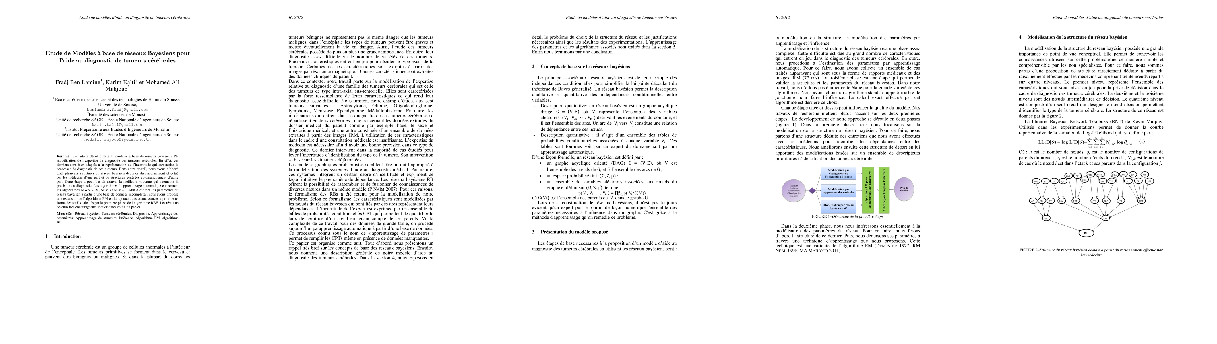 This article describes different models based on Bayesian networks RB modeling expertise in the diagnosis of brain tumors. Indeed, they are well adapted to the representation of the uncertainty in the process of diagnosis of these tumors. In our work, we first tested several structures derived from the Bayesian network reasoning performed by doctors on the one hand and structures generated automatically on the other. This step aims to find the best structure that increases diagnostic accuracy. The machine learning algorithms relate MWST-EM algorithms, SEM and SEM + T. To estimate the parameters of the Bayesian network from a database incomplete, we have proposed an extension of the EM algorithm by adding a priori knowledge in the form of the thresholds calculated by the first phase of the algorithm RBE . The very encouraging results obtained are discussed at the end of the paper