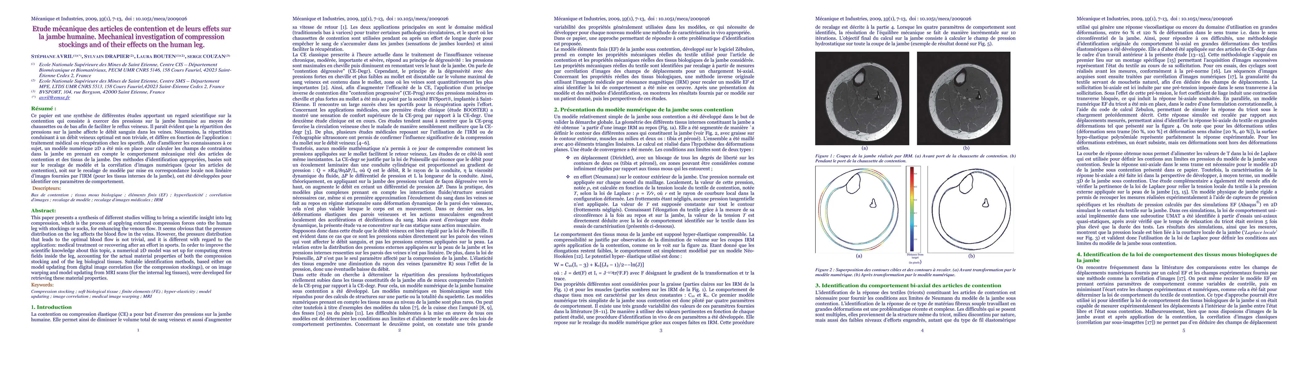 This paper presents a synthesis of different studies willing to bring a scientific insight into leg compression, which is the process of applying external compression forces onto the human leg with stockings or socks, for enhancing the venous flow. It seems obvious that the pressure distribution on the leg affects the blood flow in the veins. However, the pressure distribution that leads to the optimal blood flow is not trivial, and it is different with regard to the application: medical treatment or recovering after an effort in sports. In order to improve the scientific knowledge about this topic, a numerical 2D model was set up for computing stress fields inside the leg, accounting for the actual material properties of both the compression stocking and of the leg biological tissues. Suitable identification methods, based either on model updating from digital image correlation (for the compression stockings), or on image warping and model updating from MRI scans (for the internal leg tissues), were developed for retrieving these material properties.