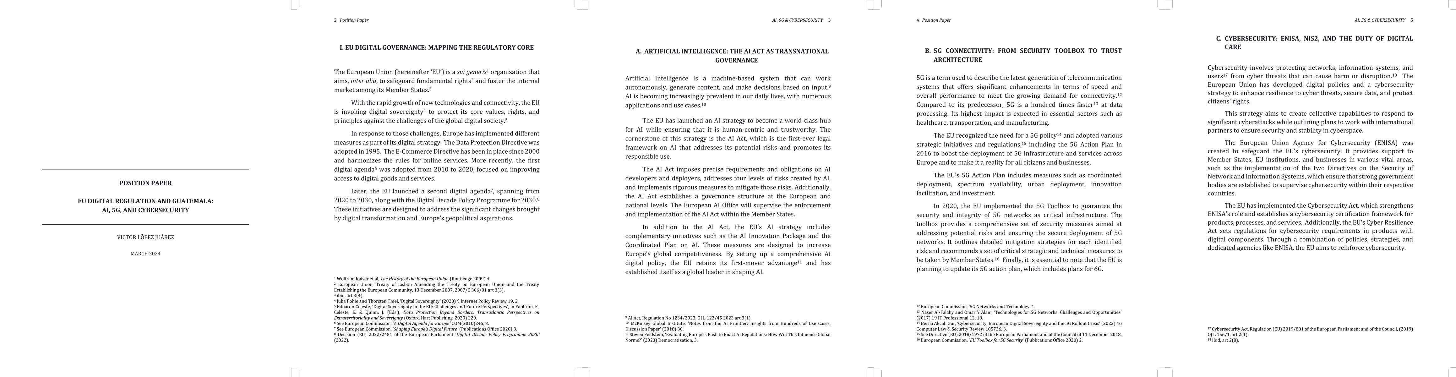 The paper examines how EU rules in AI, 5G, and cybersecurity operate as transnational governance and shape policy in Guatemala. It outlines the AI Act's risk approach, the 5G Action Plan and Security Toolbox, and the cybersecurity regime built on ENISA, NIS2, the Cybersecurity Act, and the Cyber Resilience Act. It traces extraterritorial channels such as the Brussels effect, private standards, supply chain clauses, and data transfer controls. Guatemala specific impacts include SME compliance costs, procurement limits, environmental trade-offs in rollout, rights risks, and capacity gaps. The paper maps current national measures and proposes five guardrails: digital constitutionalism, green IT duties, third country impact assessment, standards co-design, and recognition of regulatory diversity.