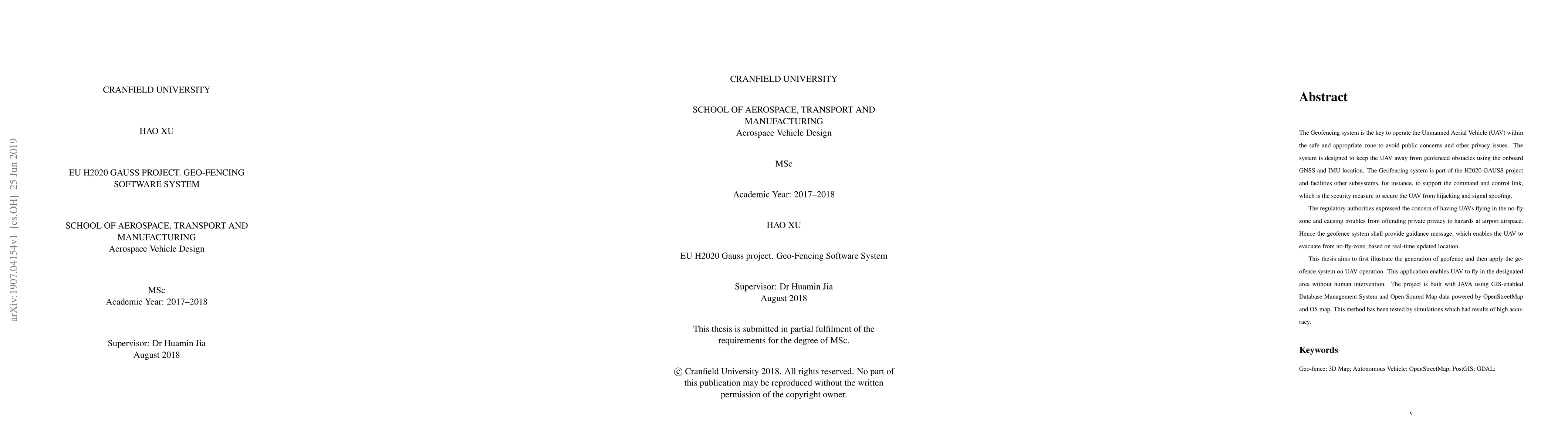 The Geofencing system is the key to operate the Unmanned Aerial Vehicle (UAV) within the safe and appropriate zone to avoid public concerns and other privacy issues. The system is designed to keep the UAV away from geofenced obstacles using the onboard GNSS and IMU location. The Geofencing system is part of the H2020 GAUSS project and facilities other subsystems, for instance, to support the command and control link, which is the security measure to secure the UAV from hijacking and signal spoofing. The regulatory authorities expressed the concern of having UAVs flying in the no-fly zone and causing troubles from offending private privacy to hazards at airport airspace. Hence the geofence system shall provide guidance message, which enables the UAV to evacuate from no-fly-zone, based on real-time updated location. This thesis aims to first illustrate the generation of geofence and then apply the geofence system on UAV operation. This application enables UAV to fly in the designated area without human intervention. The project is built with JAVA using GIS-enabled Database Management System and Open Soured Map data powered by OpenStreetMap and OS map. This method has been tested by simulations which had results of high accuracy.
