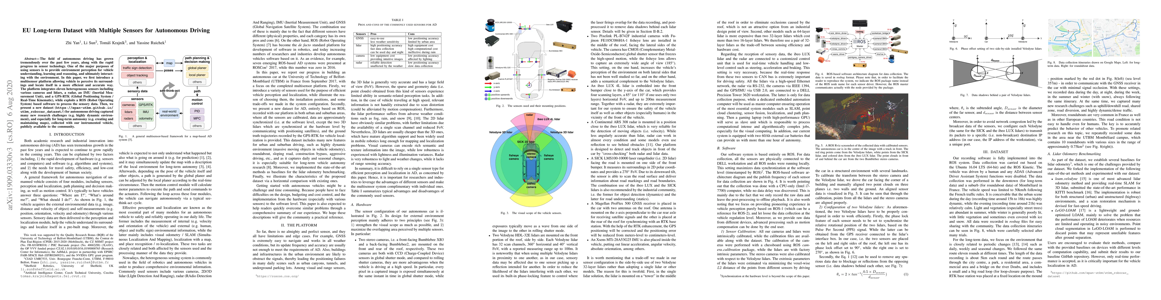 The field of autonomous driving has grown tremendously over the past few years, along with the rapid progress in sensor technology. One of the major purposes of using sensors is to provide environment perception for vehicle understanding, learning and reasoning, and ultimately interacting with the environment. In this paper, we first introduce a multisensor platform allowing vehicle to perceive its surroundings and locate itself in a more efficient and accurate way. The platform integrates eleven heterogeneous sensors including various cameras and lidars, a radar, an IMU (Inertial Measurement Unit), and a GPS-RTK (Global Positioning System / Real-Time Kinematic), while exploits a ROS (Robot Operating System) based software to process the sensory data. Then, we present a new dataset (https://epan-utbm.github.io/utbm_robocar_dataset/) for autonomous driving captured many new research challenges (e.g. highly dynamic environment), and especially for long-term autonomy (e.g. creating and maintaining maps), collected with our instrumented vehicle, publicly available to the community.