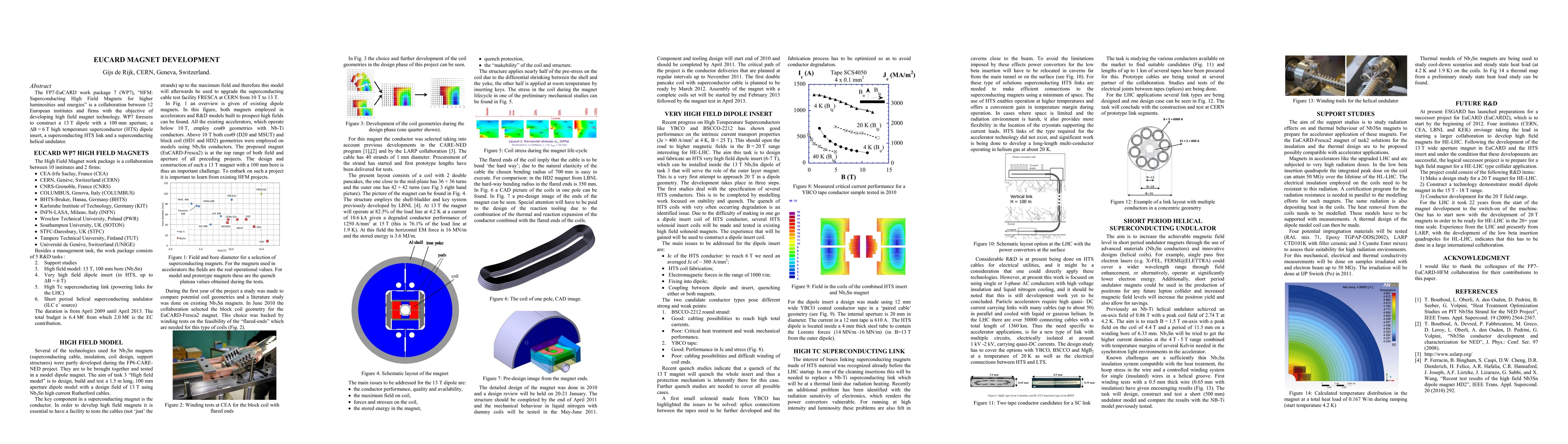 The FP7-EuCARD project, specifically WP7, is a European collaboration aiming to develop high field magnet technology. Key outcomes include plans to build a 13 T dipole magnet, a 6 T HTS dipole insert, a superconducting HTS link, and a superconducting helical undulator.