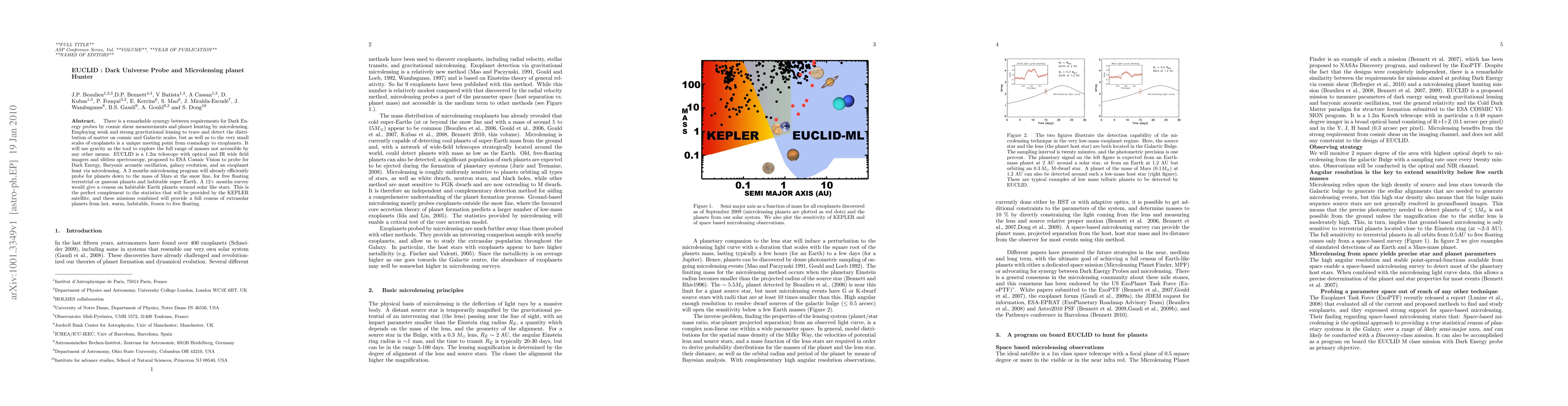 There is a remarkable synergy between requirements for Dark Energy probes by cosmic shear measurements and planet hunting by microlensing. Employing weak and strong gravitational lensing to trace and detect the distribution of matter on cosmic and Galactic scales, but as well as to the very small scales of exoplanets is a unique meeting point from cosmology to exoplanets. It will use gravity as the tool to explore the full range of masses not accessible by any other means. EUCLID is a 1.2m telescope with optical and IR wide field imagers and slitless spectroscopy, proposed to ESA Cosmic Vision to probe for Dark Energy, Baryonic acoustic oscillation, galaxy evolution, and an exoplanet hunt via microlensing. A 3 months microlensing program will already efficiently probe for planets down to the mass of Mars at the snow line, for free floating terrestrial or gaseous planets and habitable super Earth. A 12+ months survey would give a census on habitable Earth planets around solar like stars. This is the perfect complement to the statistics that will be provided by the KEPLER satellite, and these missions combined will provide a full census of extrasolar planets from hot, warm, habitable, frozen to free floating.