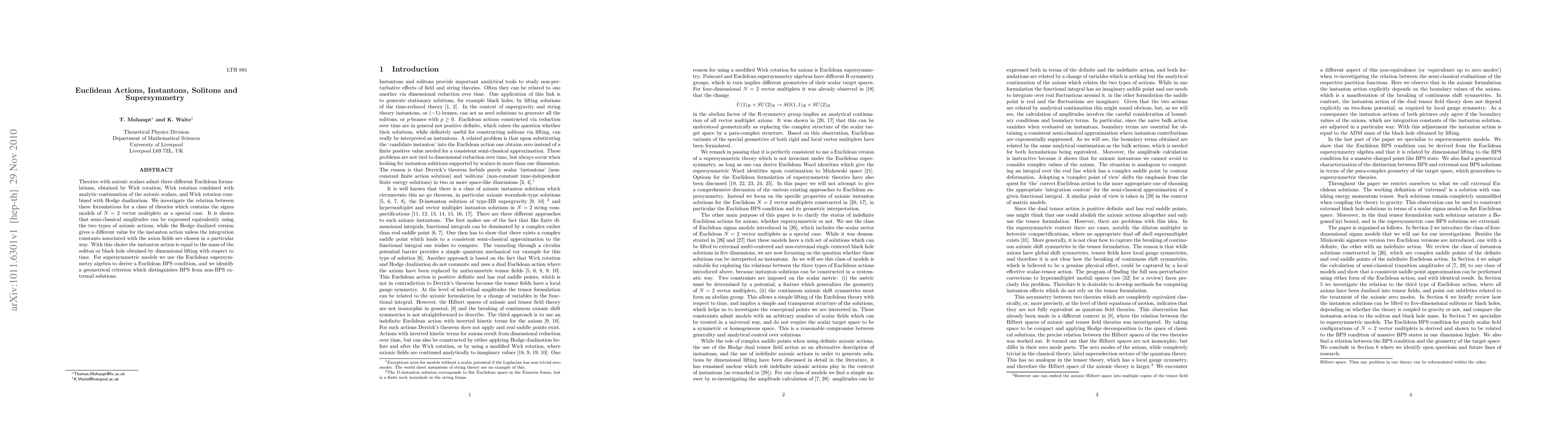 This paper explores the Euclidean formulations of theories with axionic scalars, showing that semi-classical amplitudes can be expressed equivalently using two types of axionic actions. It also reveals a special choice of integration constants that aligns the instanton action with the soliton or black hole mass, and introduces a Euclidean BPS condition for supersymmetric models.