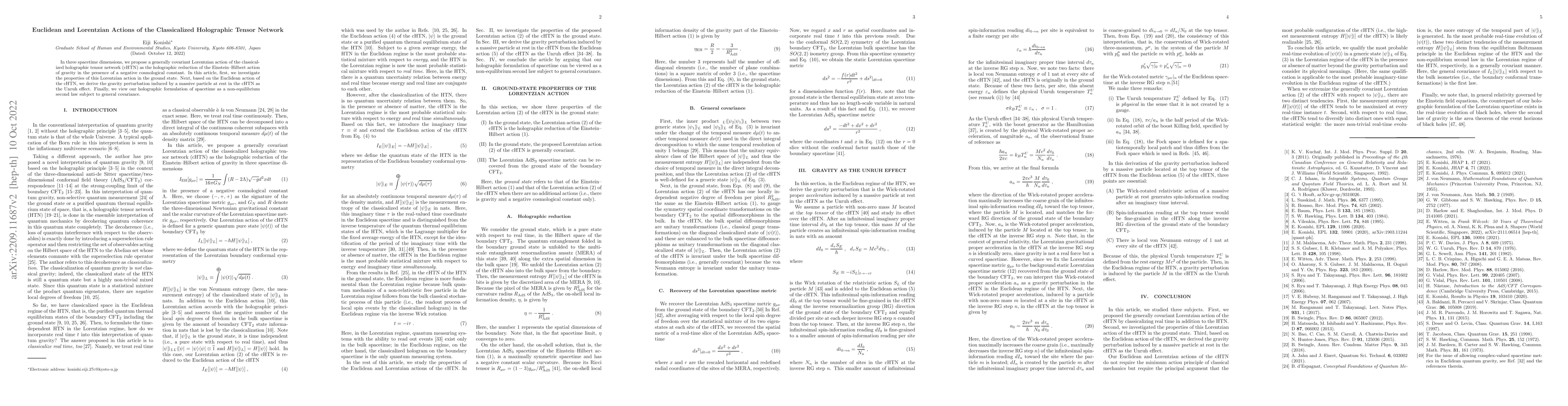 In three spacetime dimensions, we propose a generally covariant Lorentzian action of the classicalized holographic tensor network (cHTN) as the holographic reduction of the Einstein-Hilbert action of gravity in the presence of a negative cosmological constant. In this article, first, we investigate the properties of this Lorentzian action in the ground state. Next, based on the Euclidean action of the cHTN, we derive the gravity perturbation induced by a massive particle at rest in the cHTN as the Unruh effect. Finally, we view our holographic formulation of spacetime as a non-equilibrium second law subject to general covariance.