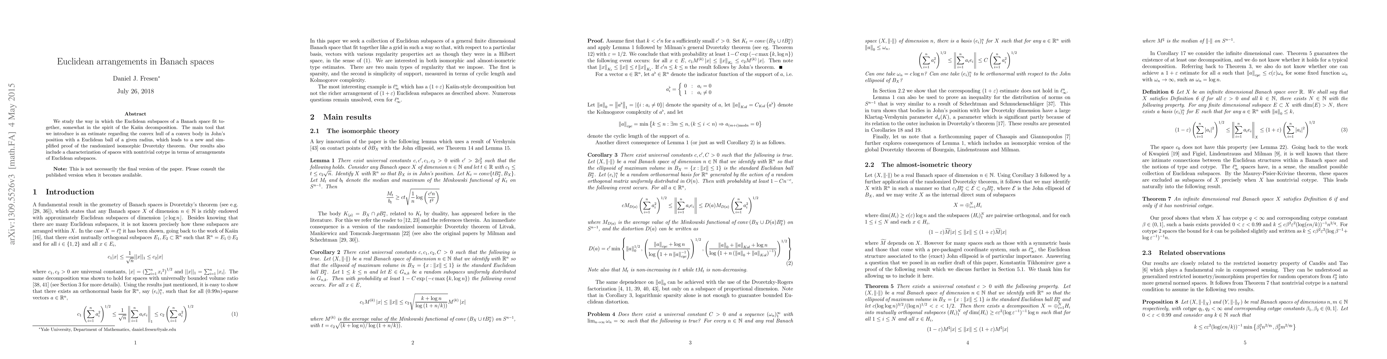 This paper investigates how Euclidean subspaces in Banach spaces interact, inspired by the Ka\v{s}in decomposition, and introduces a new estimate for the convex hull of a convex body in John's position. This leads to a simplified proof of the randomized isomorphic Dvoretzky theorem and characterizes spaces with nontrivial cotype via Euclidean arrangements.