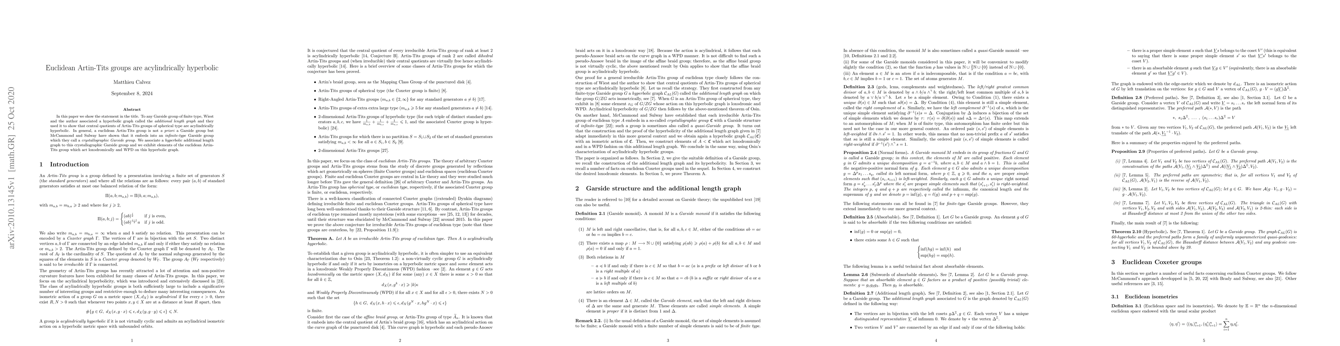 This paper demonstrates that Euclidean Artin-Tits groups are acylindrically hyperbolic by associating a hyperbolic additional length graph to a crystallographic Garside group embedding, showing elements acting loxodromically and WPD on this graph.