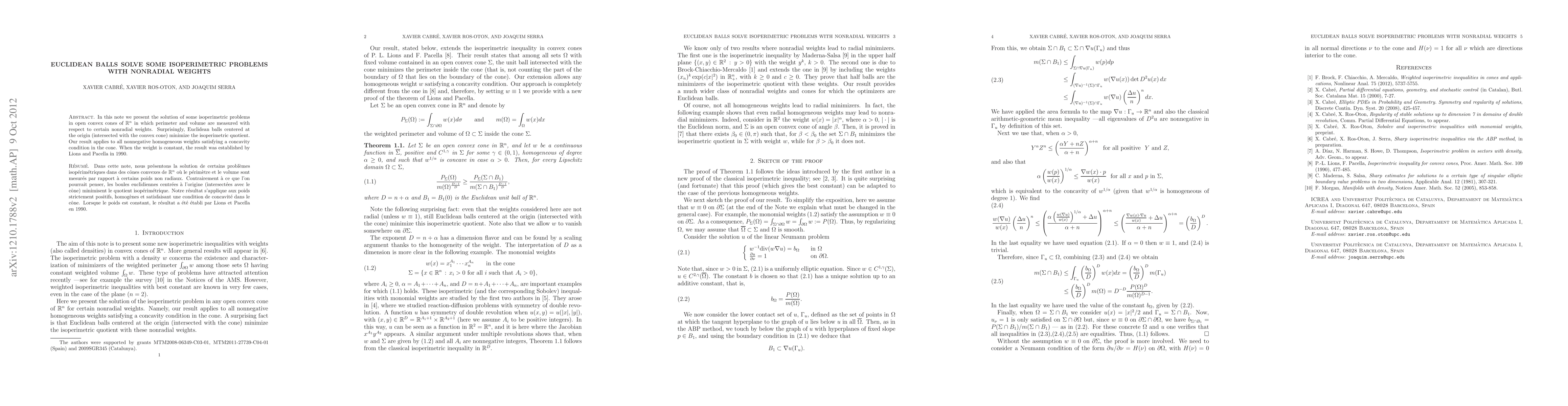 Euclidean balls centered at the origin (within open convex cones) minimize the isoperimetric quotient for certain nonradial weights, solving related isoperimetric problems. This result holds for all nonnegative homogeneous weights that satisfy a concavity condition.