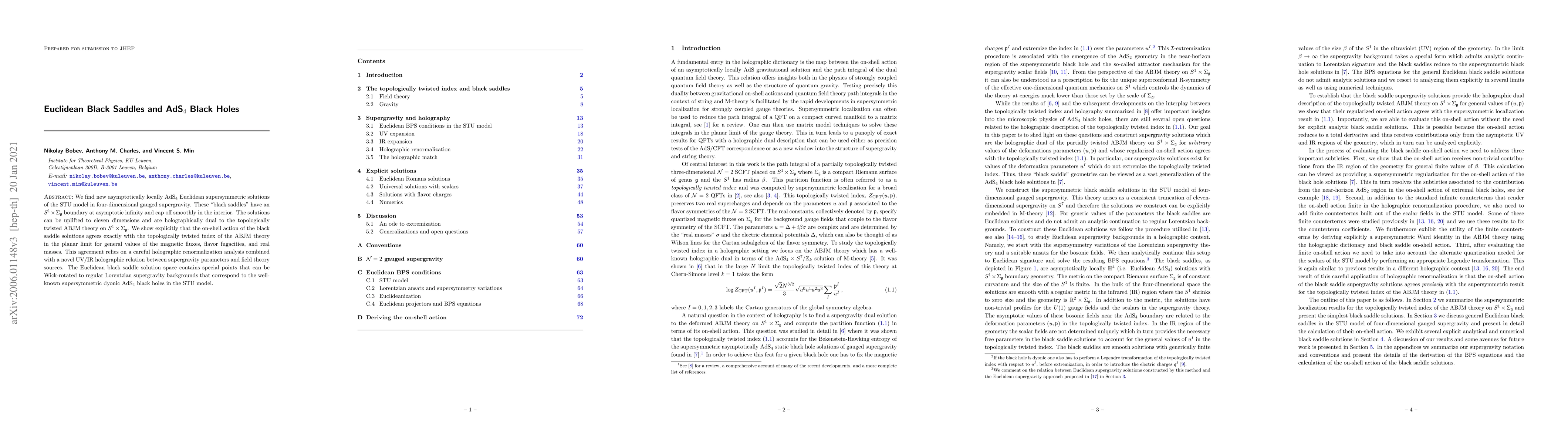 We find new asymptotically locally AdS$_4$ Euclidean supersymmetric solutions of the STU model in four-dimensional gauged supergravity. These "black saddles" have an $S^1\times \Sigma_{\mathfrak{g}}$ boundary at asymptotic infinity and cap off smoothly in the interior. The solutions can be uplifted to eleven dimensions and are holographically dual to the topologically twisted ABJM theory on $S^1\times \Sigma_{\mathfrak{g}}$. We show explicitly that the on-shell action of the black saddle solutions agrees exactly with the topologically twisted index of the ABJM theory in the planar limit for general values of the magnetic fluxes, flavor fugacities, and real masses. This agreement relies on a careful holographic renormalization analysis combined with a novel UV/IR holographic relation between supergravity parameters and field theory sources. The Euclidean black saddle solution space contains special points that can be Wick-rotated to regular Lorentzian supergravity backgrounds that correspond to the well-known supersymmetric dyonic AdS$_4$ black holes in the STU model.