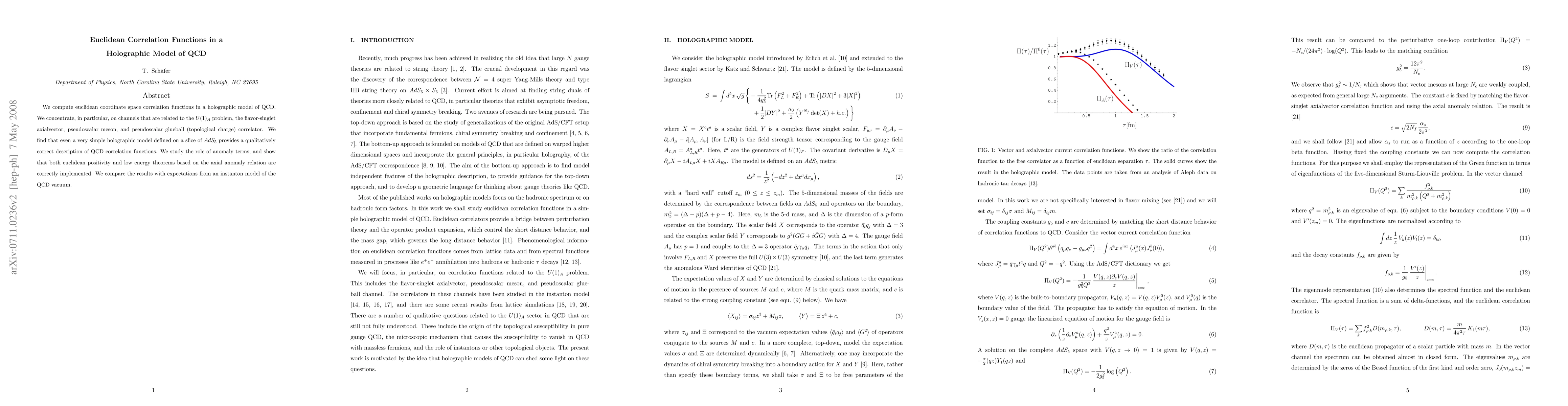This paper computes Euclidean correlation functions in a holographic QCD model, focusing on channels related to the U(1)_A problem, and finds that a simple AdS_5 model provides a qualitatively correct description of QCD correlators, correctly implementing euclidean positivity and low energy theorems based on the axial anomaly relation. Comparisons with instanton models of the QCD vacuum are also made.