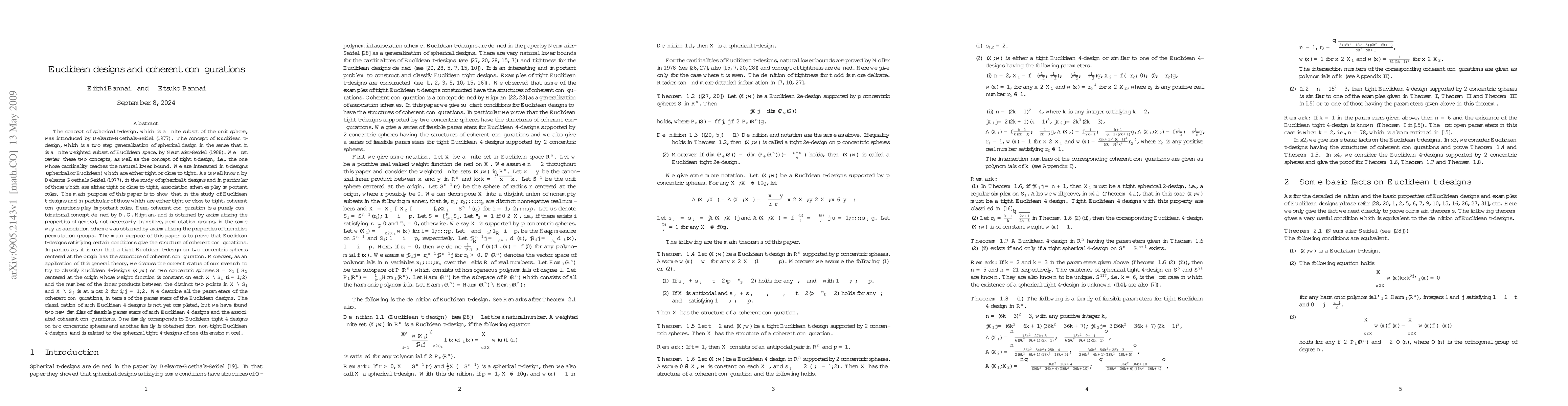The concept of spherical $t$-design, which is a finite subset of the unit sphere, was introduced by Delsarte-Goethals-Seidel (1977). The concept of Euclidean $t$-design, which is a two step generalization of spherical design in the sense that it is a finite weighted subset of Euclidean space, by Neumaier-Seidel (1988). We first review these two concepts, as well as the concept of tight $t$-design, i.e., the one whose cardinality reaches the natural lower bound. We are interested in $t$-designs (spherical or Euclidean) which are either tight or close to tight. As is well known by Delsarte-Goethals-Seidel (1977), in the study of spherical $t$-designs and in particular of those which are either tight or close to tight, association schemes play important roles. The main purpose of this paper is to show that in the study of Euclidean $t$-designs and in particular of those which are either tight or close to tight, coherent configurations play important roles. Here, coherent configuration is a purely combinatorial concept defined by D. G. Higman, and is obtained by axiomatizing the properties of general, not necessarily transitive, permutation groups, in the same way as association scheme was obtained by axiomatizing the properties of transitive permutation groups. The main purpose of this paper is to prove that Euclidean $t$-designs satisfying certain conditions give the structure of coherent configurations. Moreover we study the classification problems of Euclidean 4-designs on two concentric spheres with certain additional conditions.