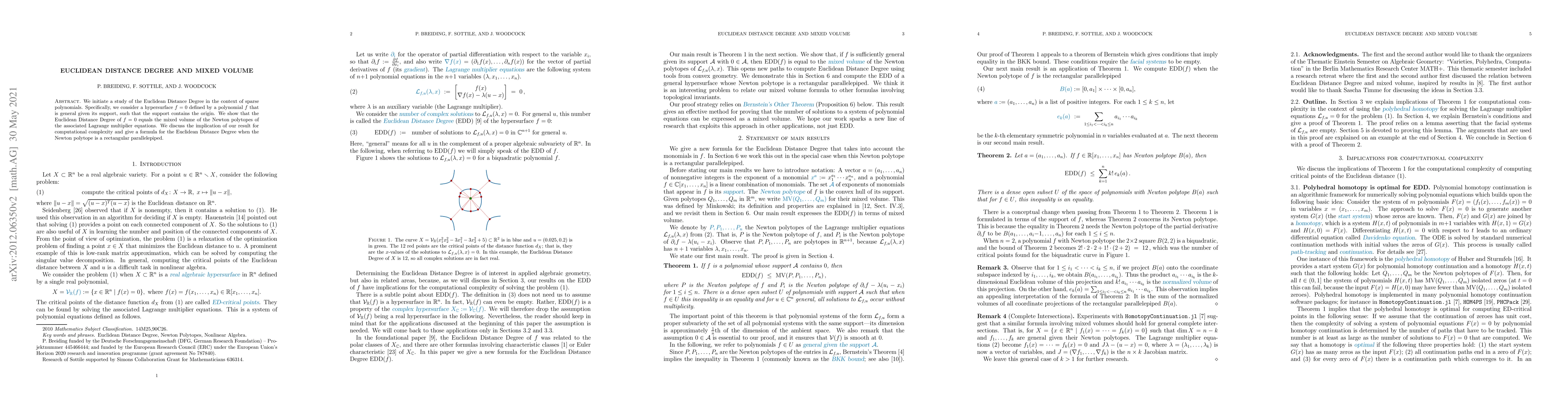 This paper investigates the Euclidean Distance Degree (EDD) of sparse polynomials, demonstrating that it equals the mixed volume of the Newton polytopes of the Lagrange multiplier equations. The authors also provide computational complexity implications and a formula for EDD when the Newton polytope is a rectangular parallelepiped.