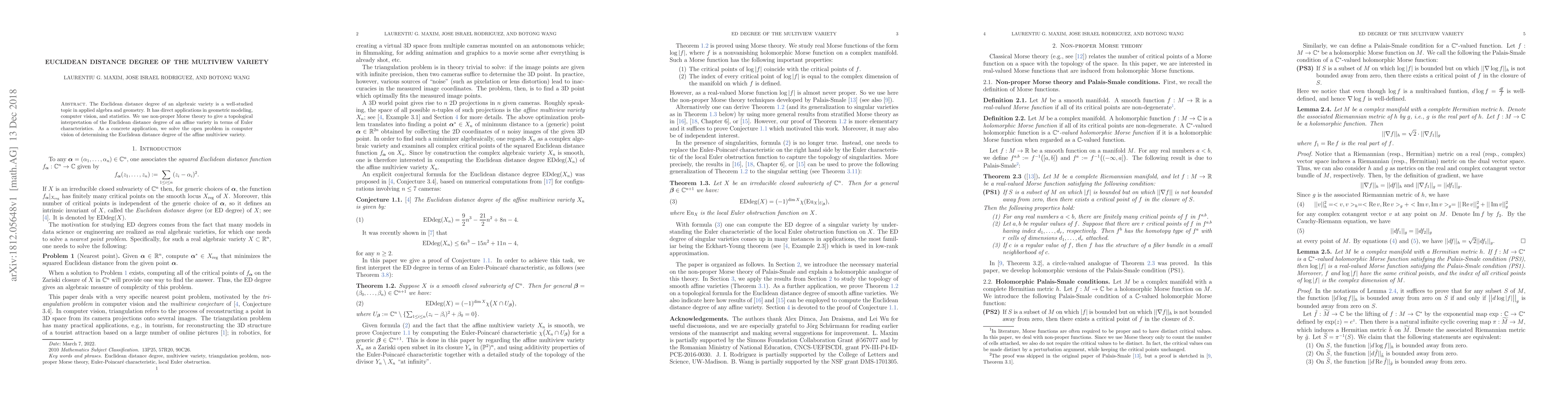 This research uses non-proper Morse theory to provide a topological interpretation of the Euclidean distance degree of an affine variety through Euler characteristics, specifically solving the open problem of determining this degree for the affine multiview variety in computer vision.