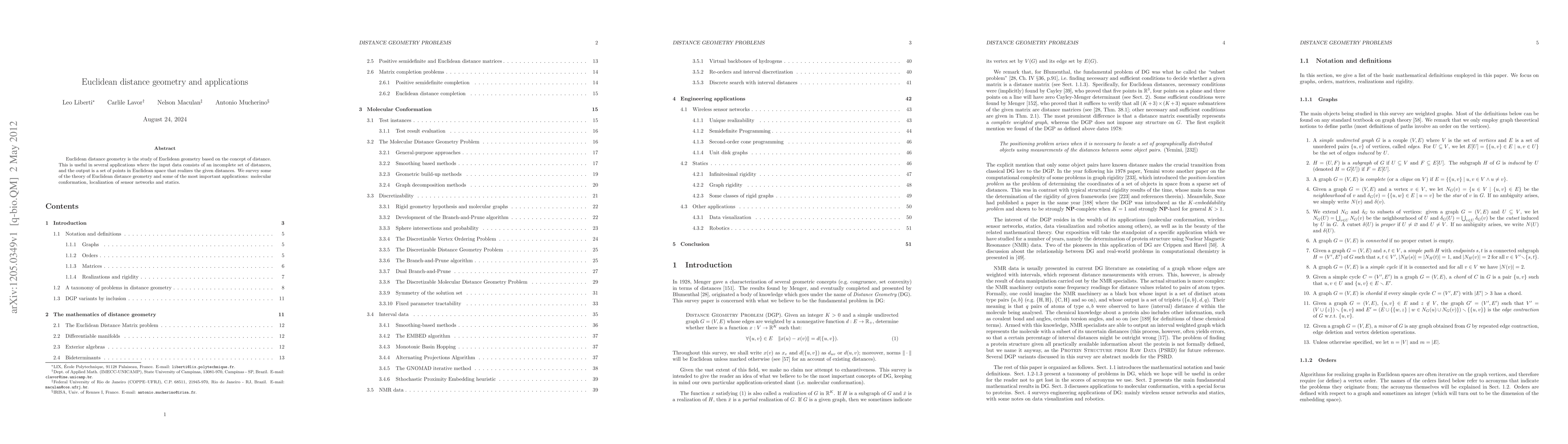 Euclidean distance geometry explores the relationships between points in Euclidean space based on distance constraints. Its applications include determining molecular structures, optimizing sensor network placements, and solving statics problems.