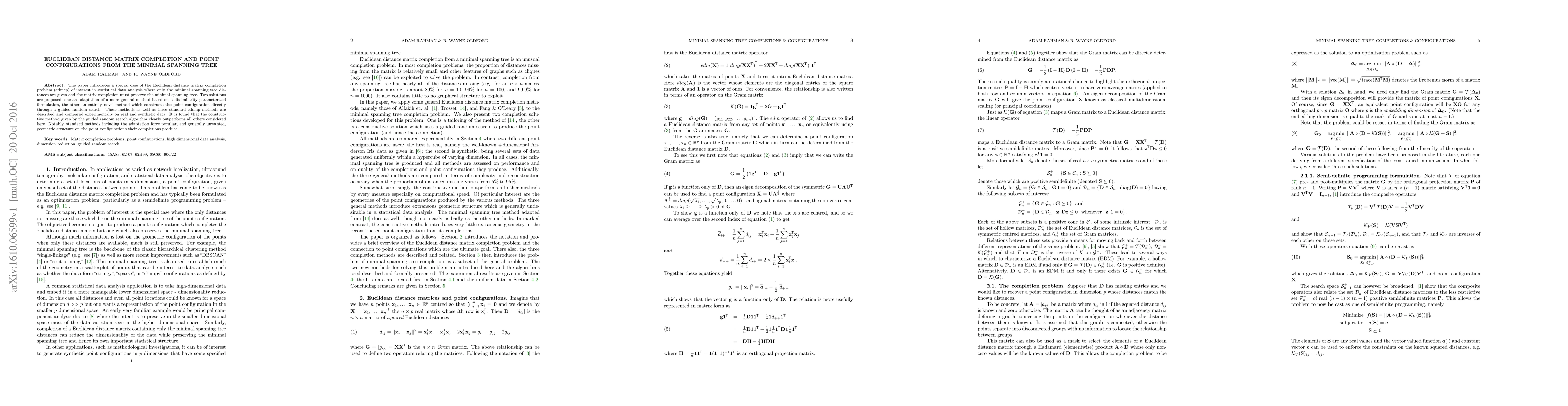 The paper introduces a special case of the Euclidean distance matrix completion problem (edmcp) of interest in statistical data analysis where only the minimal spanning tree distances are given and the matrix completion must preserve the minimal spanning tree. Two solutions are proposed, one an adaptation of a more general method based on a dissimilarity parameterized formulation, the other an entirely novel method which constructs the point configuration directly through a guided random search. These methods as well as three standard edcmp methods are described and compared experimentally on real and synthetic data. It is found that the constructive method given by the guided random search algorithm clearly outperforms all others considered here. Notably, standard methods including the adaptation force peculiar, and generally unwanted, geometric structure on the point configurations their completions produce.