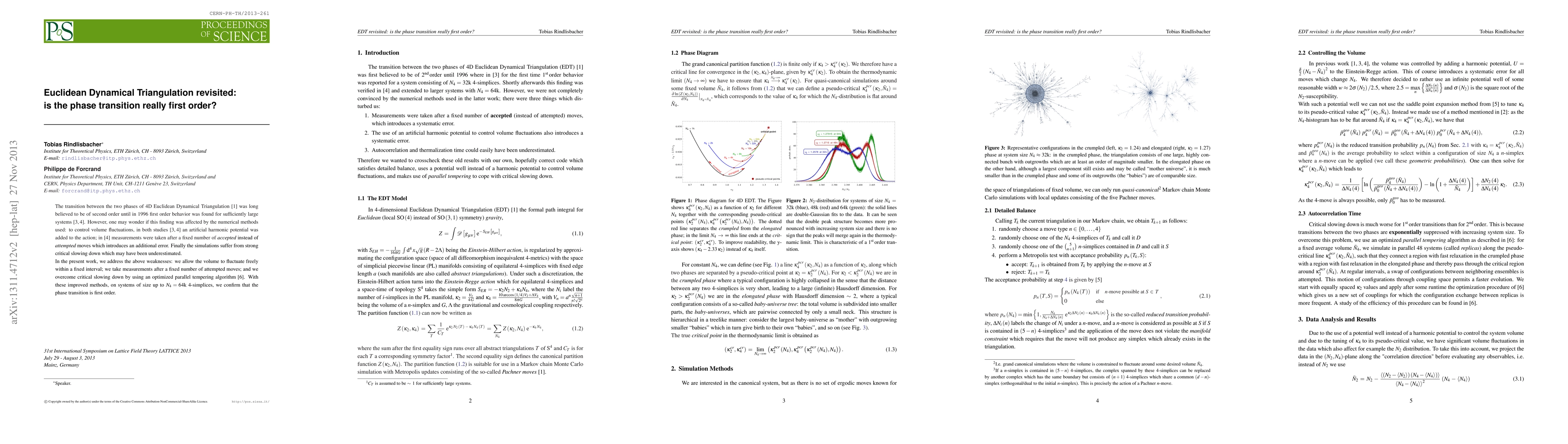 This paper revisits the phase transition in 4D Euclidean Dynamical Triangulation, confirming first-order behavior despite previous second-order assumptions. Improved numerical methods, including free volume fluctuations and optimized parallel tempering, were used to mitigate previous errors and critical slowing down.