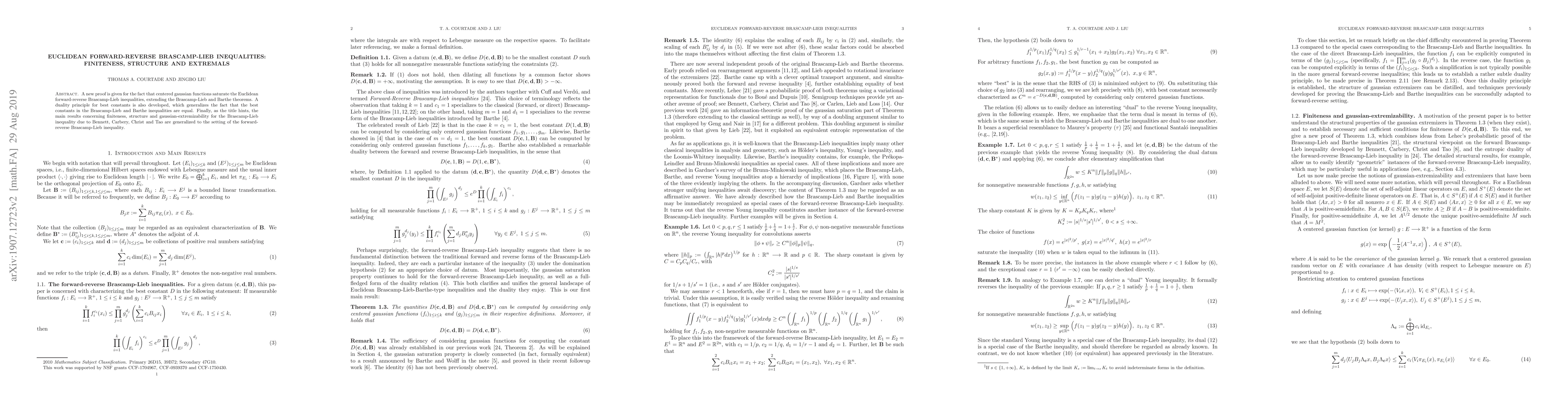 A new proof is given for the fact that centered gaussian functions saturate the Euclidean forward-reverse Brascamp-Lieb inequalities, extending the Brascamp-Lieb and Barthe theorems. A duality principle for best constants is also developed, which generalizes the fact that the best constants in the Brascamp-Lieb and Barthe inequalities are equal. Finally, as the title hints, the main results concerning finiteness, structure and gaussian-extremizability for the Brascamp-Lieb inequality due to Bennett, Carbery, Christ and Tao are generalized to the setting of the forward-reverse Brascamp-Lieb inequality.