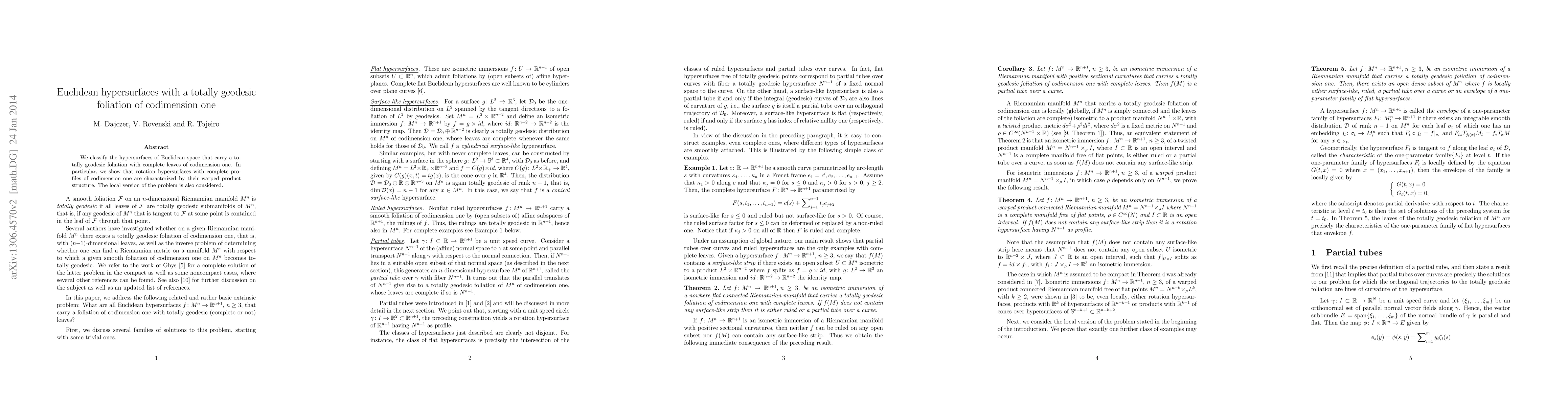 This paper classifies Euclidean hypersurfaces with a totally geodesic foliation of codimension one, showing that rotation hypersurfaces with such profiles are characterized by their warped product structure. The study also addresses the local version of the problem.