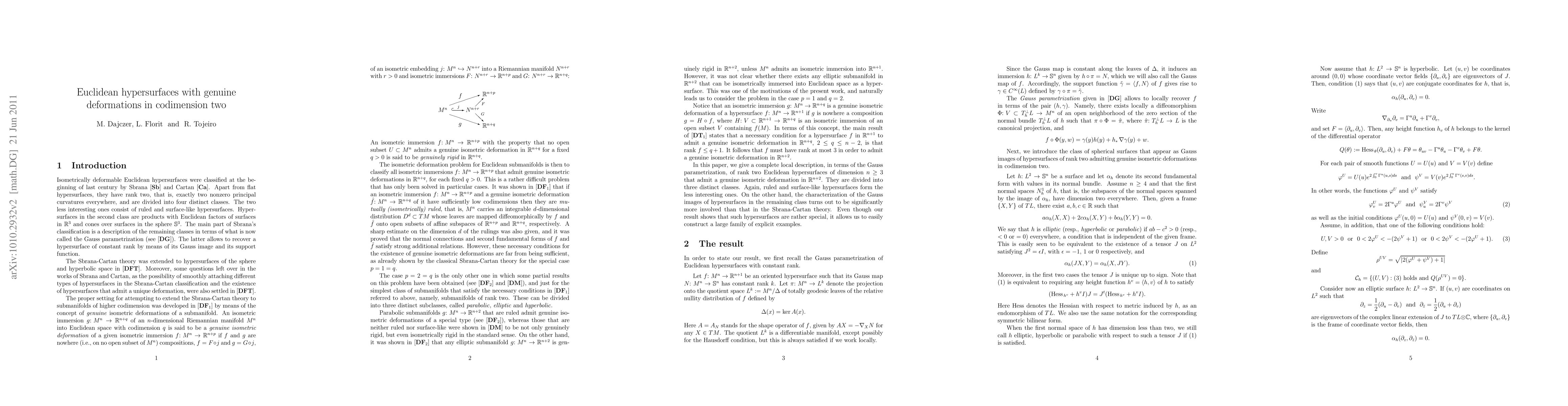 We classify hypersurfaces of rank two of Euclidean space $\R^{n+1}$ that admit genuine isometric deformations in $\R^{n+2}$. That an isometric immersion $\hat f\colon\,M^n\to\R^{n+2}$ is a genuine isometric deformation of a hypersurface $f\colon\, M^n\to\R^{n+1}$ means that $\hat f$ is nowhere a composition $\hat f=\hat F\circ f$, where $\hat F\colon\,V\subset \R^{n+1}\to\R^{n+2}$ is an isometric immersion of an open subset $V$ containing $f(M)$.