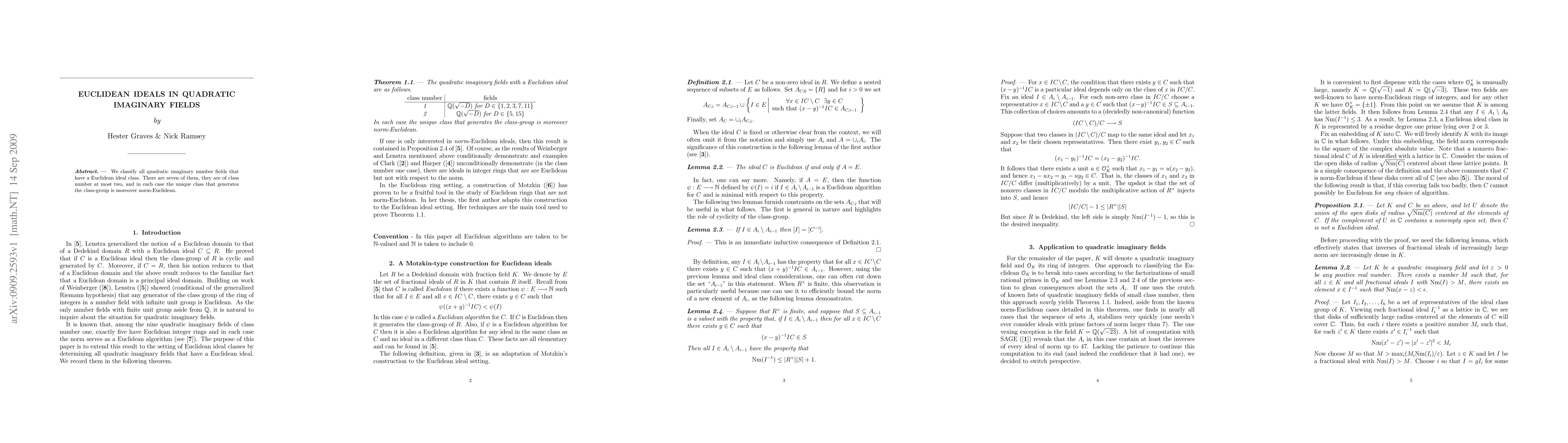 Summary: This paper classifies seven quadratic imaginary number fields with Euclidean ideal classes, all of which have class numbers at most two, with the unique class generating the class-group being norm-Euclidean.