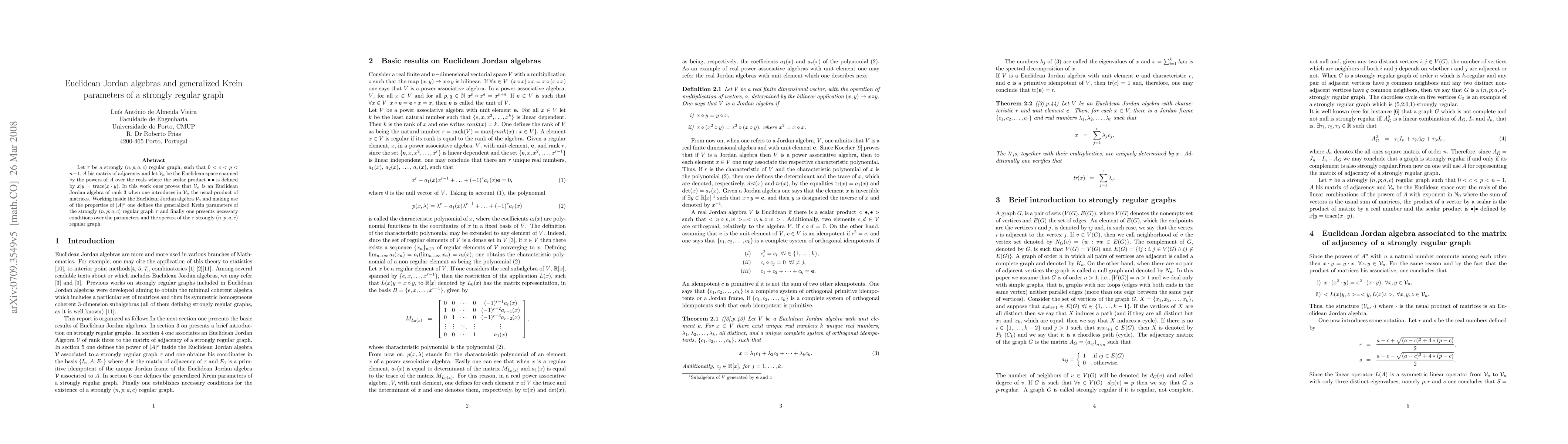 This paper proves that the Euclidean space ${\cal V}_{n}$ spanned by the powers of the adjacency matrix of a strongly regular graph $\tau$ forms an Euclidean Jordan algebra of rank 3. It defines generalized Krein parameters within this algebra and presents necessary conditions relating these parameters to the graph's parameters and spectrum.
