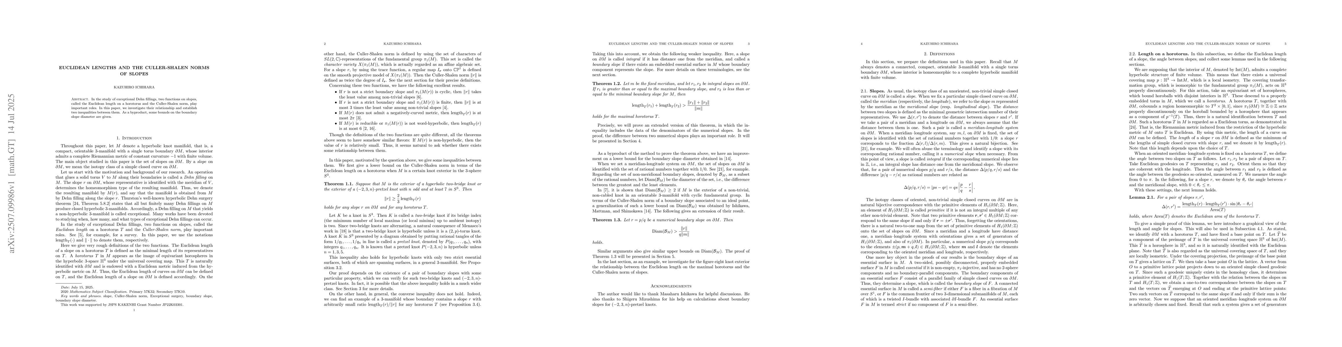 In the study of exceptional Dehn fillings, two functions on slopes, called the Euclidean length on a horotorus and the Culler-Shalen norm, play important roles. In this paper, we investigate their relationship and establish two inequalities between them. As a byproduct, some bounds on the boundary slope diameter are given.