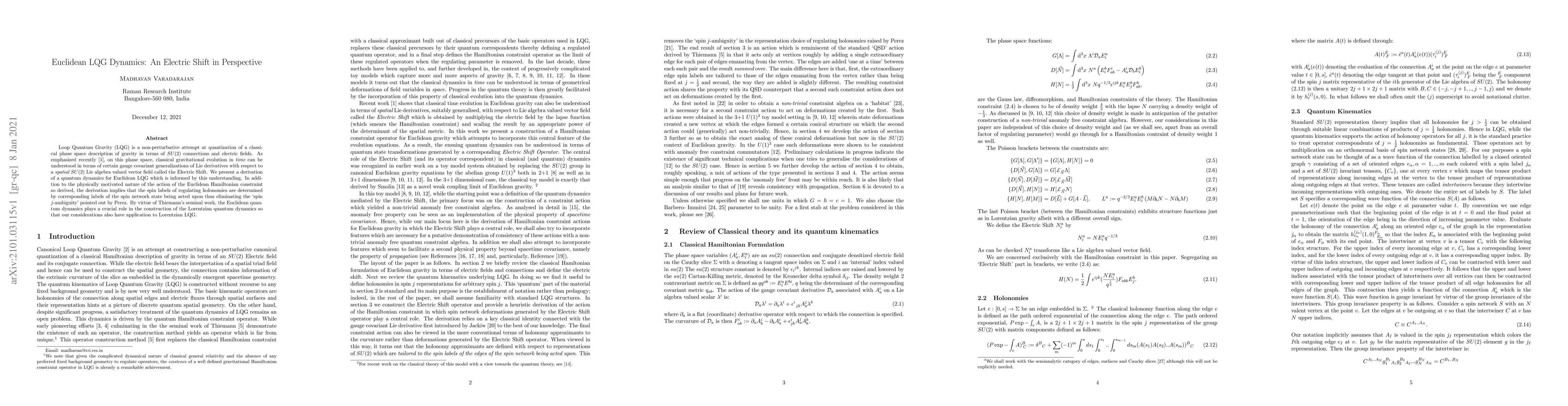 This paper develops a quantum dynamics for Euclidean Loop Quantum Gravity (LQG) based on the Electric Shift, a gauge covariant generalization of Lie derivatives, which resolves the spin j-ambiguity and has implications for the construction of Lorentzian quantum dynamics. The approach provides a physically motivated Hamiltonian constraint and determines spin labels in spin network states.