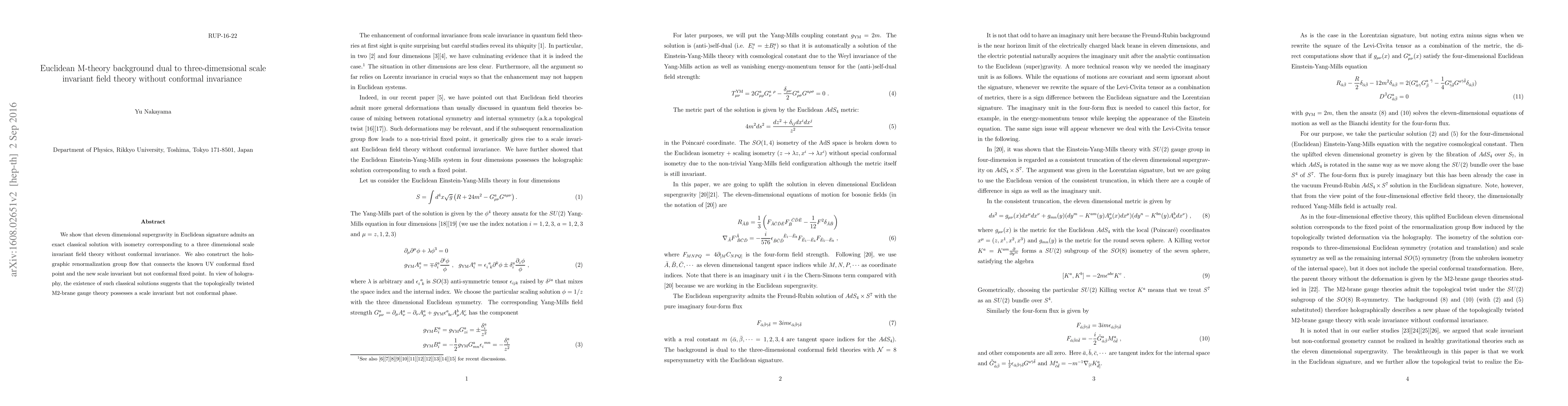 This paper presents a classical solution for eleven-dimensional supergravity in Euclidean signature, corresponding to a three-dimensional scale invariant field theory without conformal invariance. It also constructs a holographic renormalization group flow connecting a UV conformal fixed point to this new scale invariant fixed point, suggesting a scale invariant but not conformal phase in topologically twisted M2-brane gauge theory.